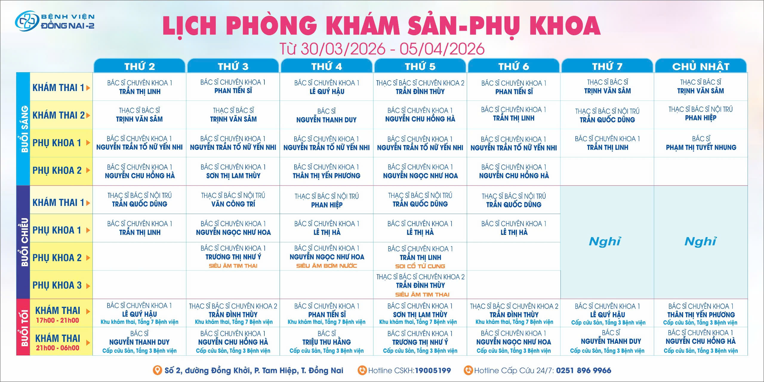 LỊCH PHÒNG KHÁM SẢN PHỤ KHOA TỪ NGÀY 30/03 – 05/04/2026