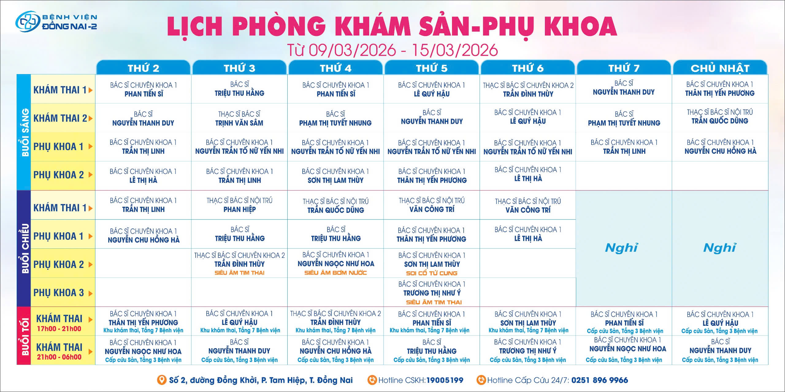 LỊCH PHÒNG KHÁM SẢN PHỤ KHOA TỪ NGÀY 09/3 – 15/3/2026