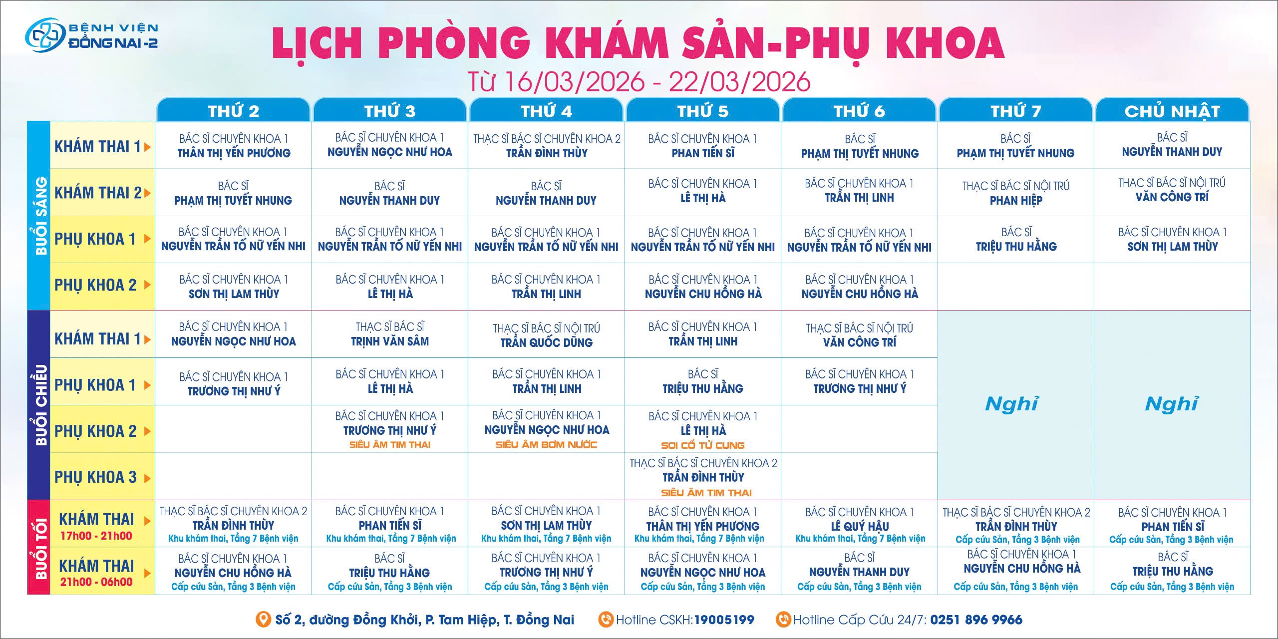 LỊCH PHÒNG KHÁM SẢN PHỤ KHOA TỪ NGÀY 16/3 – 22/3/2026