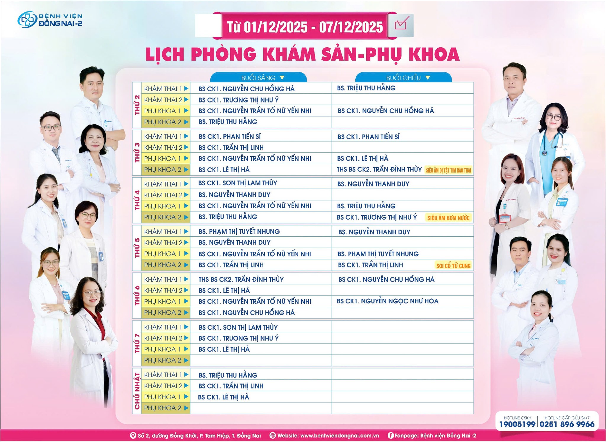 LỊCH PHÒNG KHÁM SẢN PHỤ KHOA TỪ NGÀY 01/12 – 07/12/2025