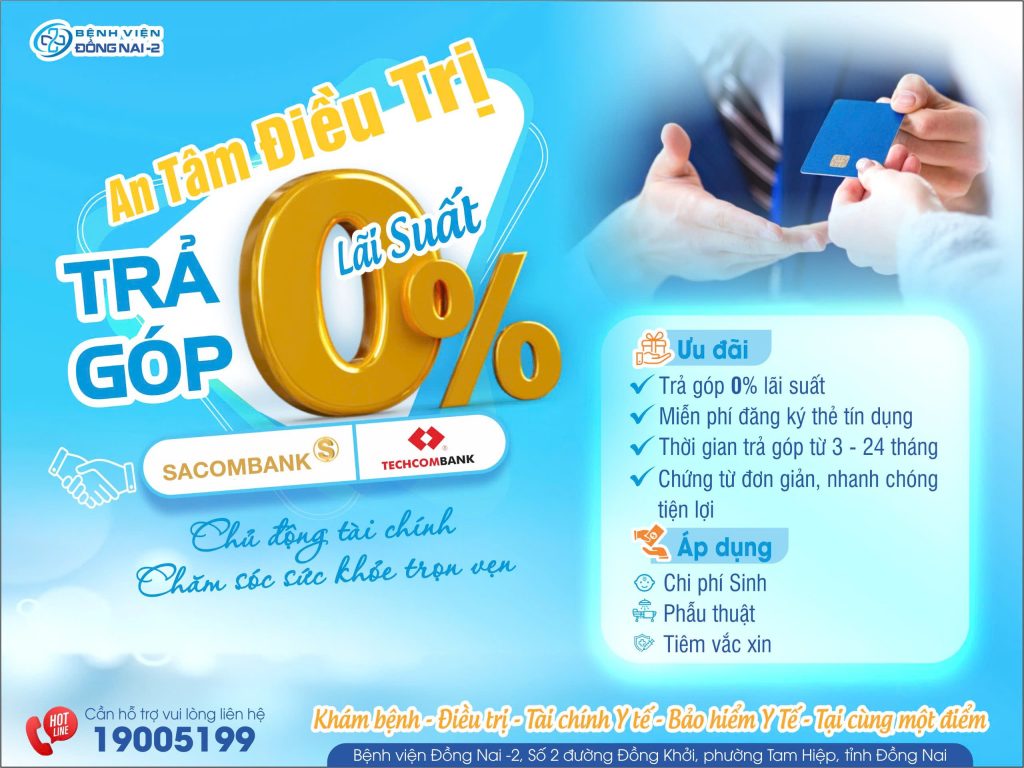 Thấu hiểu những lo ngại về chi phí trong quá trình chăm sóc sức khỏe, Bệnh viện Đồng Nai -2 phối hợp cùng ngân hàng Sacombank và Techcombank triển khai chương trình “An tâm điều trị – Trả góp lãi suất 0%”. Đây là giải pháp tài chính ưu việt, giúp Quý khách hàng chủ động kế hoạch tài chính để tận hưởng dịch vụ y tế chất lượng cao mà không bị áp lực về kinh tế.