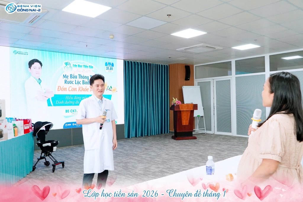 Tại buổi học, các mẹ bầu đã có cơ hội lắng nghe những chia sẻ vô cùng tâm huyết và bổ ích từ BS. CKI Phan Tiến Sĩ – Phó Khoa Phụ Sản, Bệnh viện Đồng Nai -2. Với kinh nghiệm dày dặn và cách truyền đạt gần gũi, Bác sĩ Sĩ đã giúp các mẹ giải tỏa những lo lắng về hành trình vượt cạn, cách chăm sóc sức khỏe thai kỳ đúng cách để mẹ khỏe, bé thông minh, sẵn sàng tinh thần tốt nhất để “rước lộc” bình an trong năm mới.