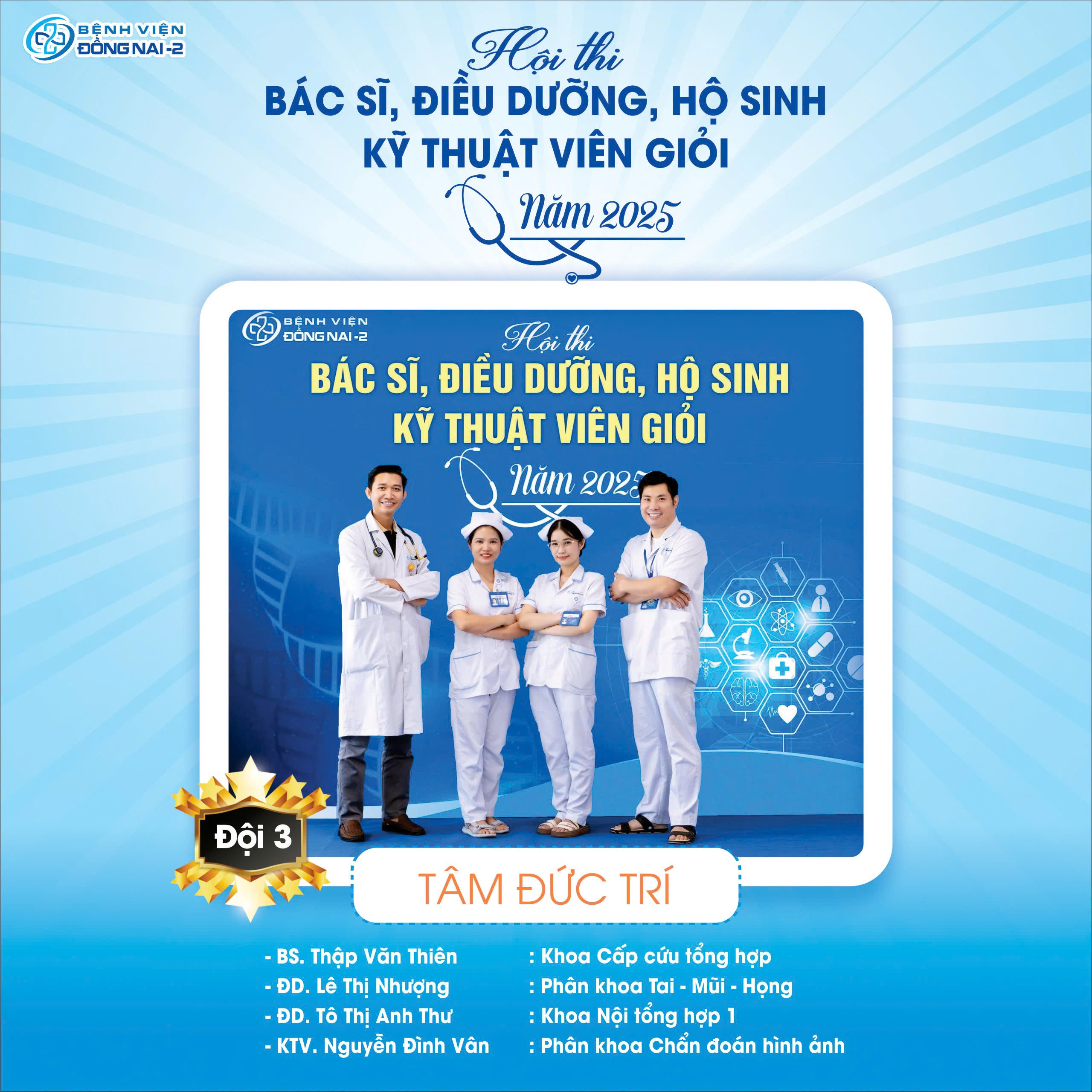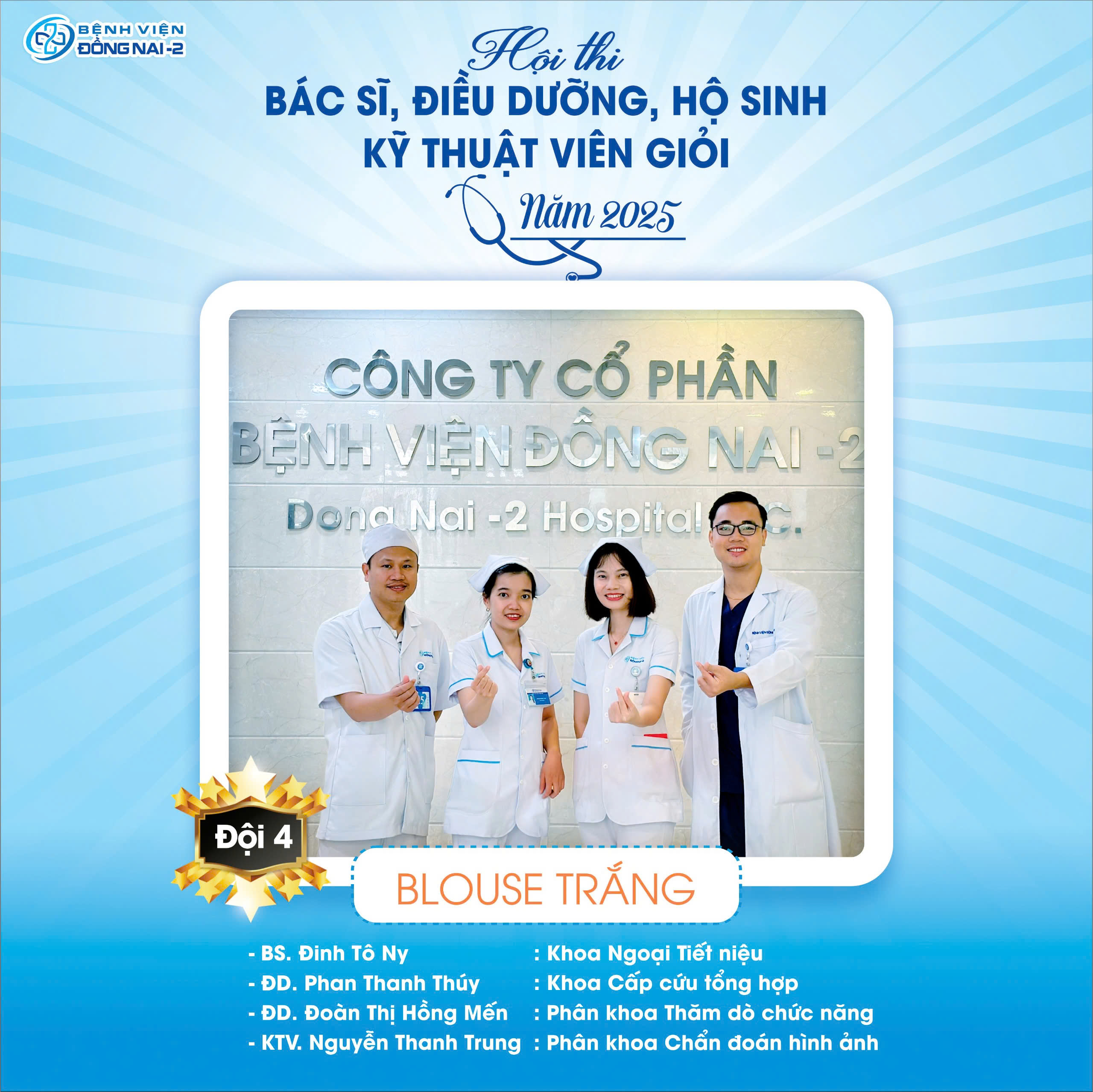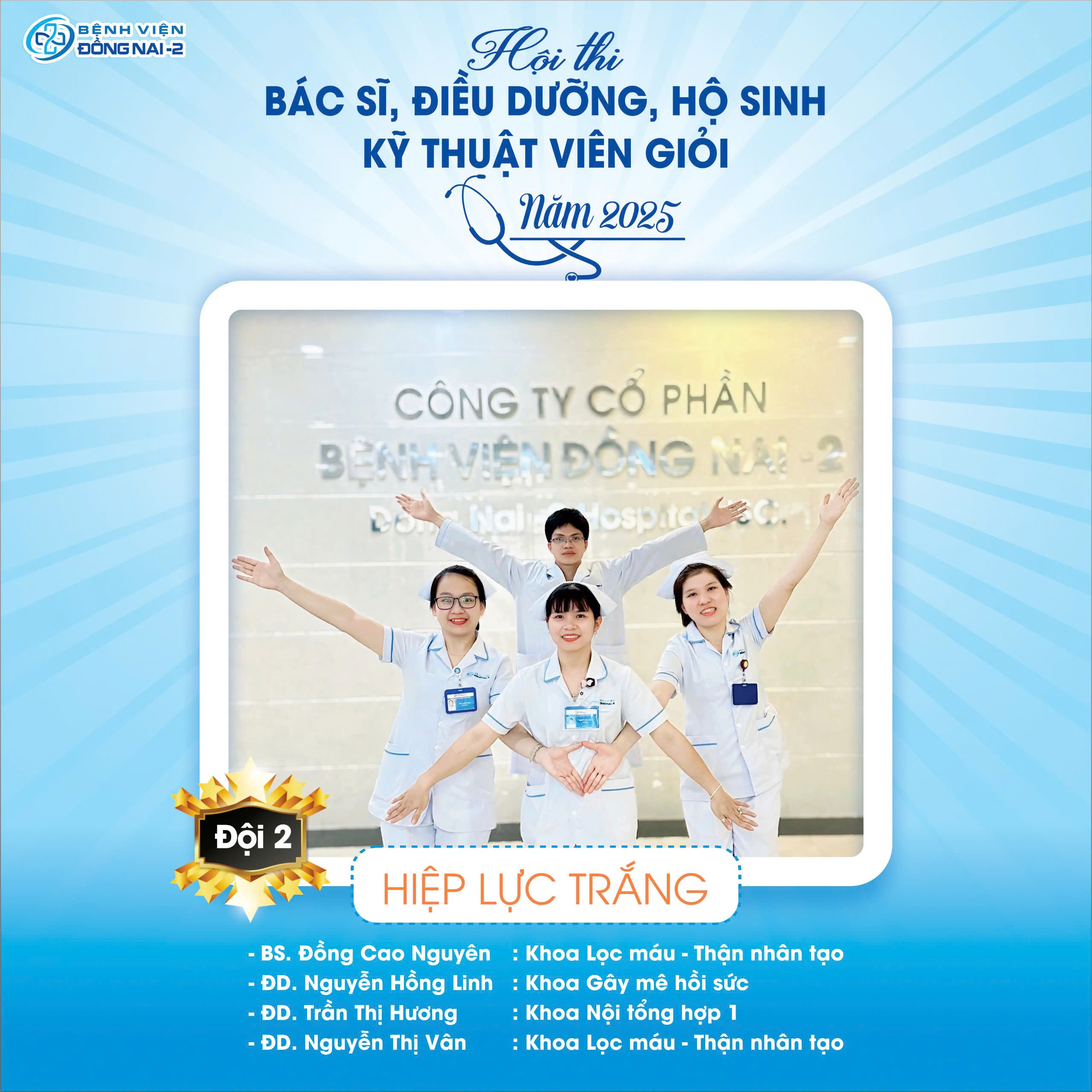 Trải qua các vòng loại nghiêm túc, sôi nổi và chất lượng, Hội thi Bác sĩ – Điều dưỡng – Hộ sinh – Kỹ thuật viên giỏi năm 2025 do Bệnh viện Đồng Nai -2 tổ chức đã chính thức bước vào vòng thi quyết định. Ban tổ chức đã chọn ra các thí sinh ưu tú nhất được chia thành 4 đội thi bước tiếp vào Vòng Chung kết như sau: