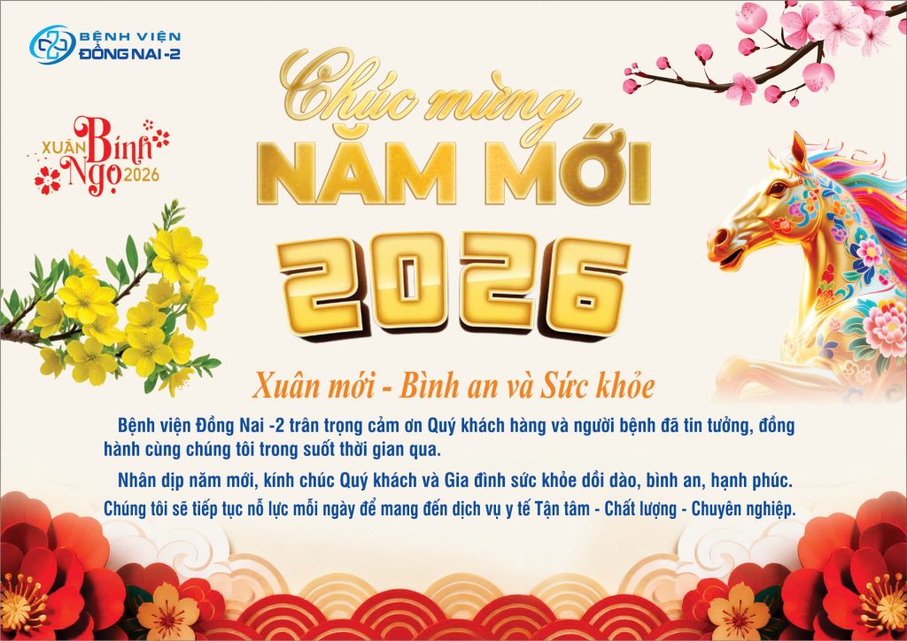 Trong không khí hân hoan và rạng rỡ của những ngày đầu xuân Bính Ngọ 2026, Bệnh viện Đồng Nai -2 trân trọng gửi đến Quý khách hàng, Quý đối tác cùng toàn thể cán bộ, nhân viên y tế lời chúc mừng năm mới nồng ấm và chân thành nhất.
