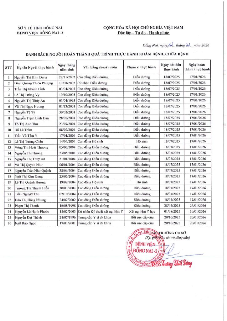 Bệnh viện Đồng Nai -2 công bố danh sách người thực hành đã hoàn thành quá trình thực hành khám chữa bệnh tại Bệnh viện Đồng Nai -2 đợt tháng 2 năm 2026 theo danh sách dưới đây:
