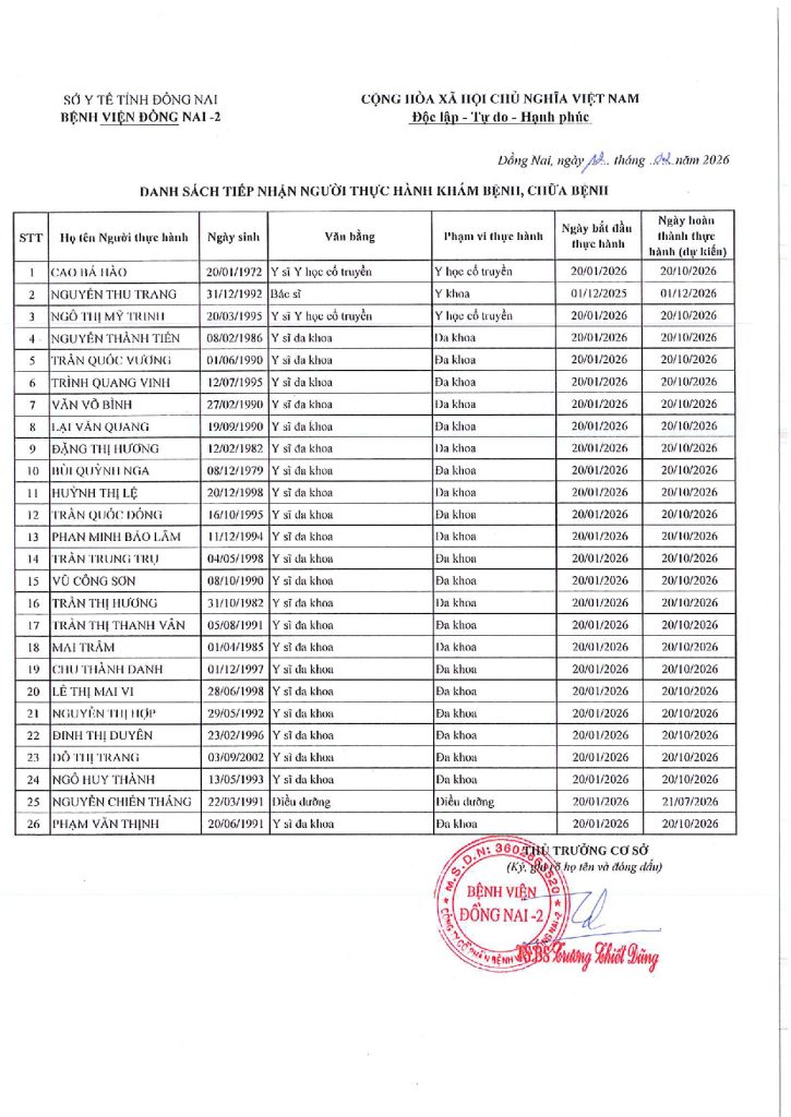 Bệnh viện Đồng Nai -2 thông báo danh sách tiếp nhận người thực hành khám chữa bệnh tại Bệnh viện Đồng Nai -2 đợt tháng 02/2026 năm 2026 theo danh sách dưới đây: