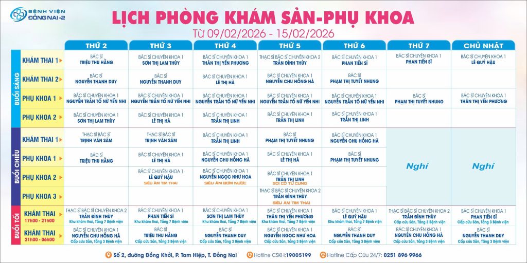 Nhằm thuận tiện cho việc đăng ký khám chữa bệnh tại khoa Phụ sản, Bệnh viện Đồng Nai -2 xin trân trọng thông báo lịch khám tại Bệnh viện từ ngày 09/02/2026 đến ngày 15/02/2026.
