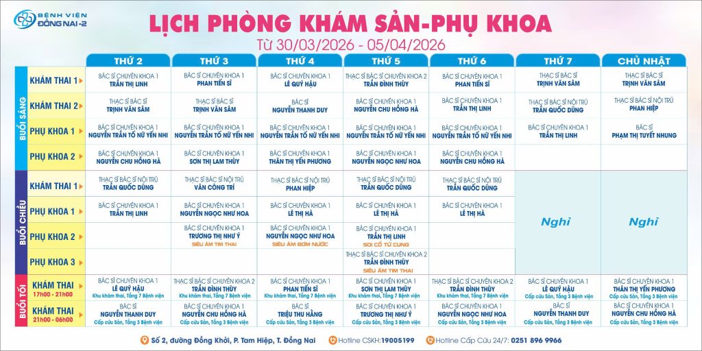 Nhằm thuận tiện cho việc đăng ký khám chữa bệnh tại khoa Phụ sản, Bệnh viện Đồng Nai -2 xin trân trọng thông báo lịch khám tại Bệnh viện từ ngày 30/03/2026 đến ngày 05/04/2026.