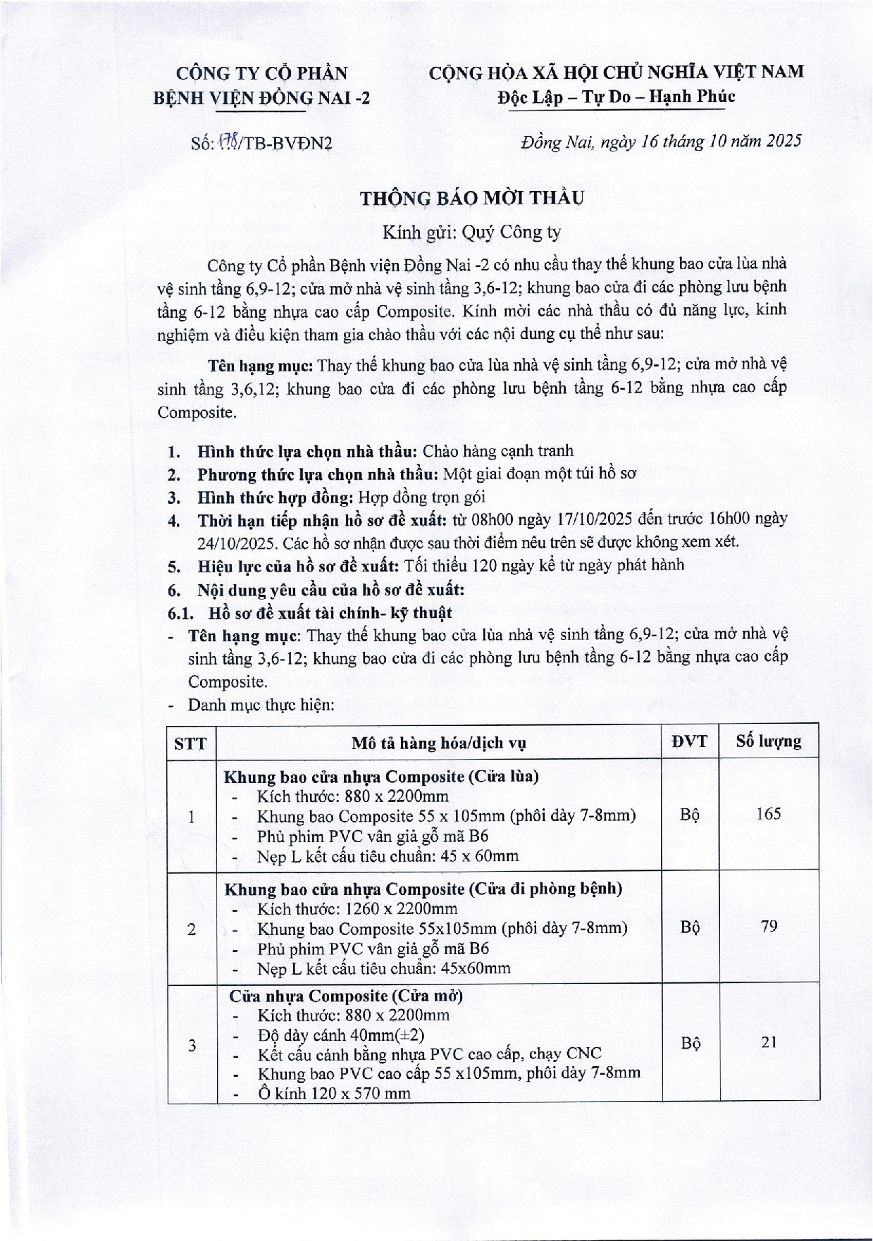 Công ty Cổ phần Bệnh viện Đồng Nai -2 là chủ dự án Bệnh viện Đồng Nai -2, địa chỉ số 2 đường Đồng Khởi, P. Tam Hiệp, tỉnh Đồng Nai. Hiện nay, Công ty chúng tôi đang triển khai mời thầu “MỜI THẦU THAY BAO KHUNG CỬA NHỰA COMPOSITE” tại Bệnh viện.