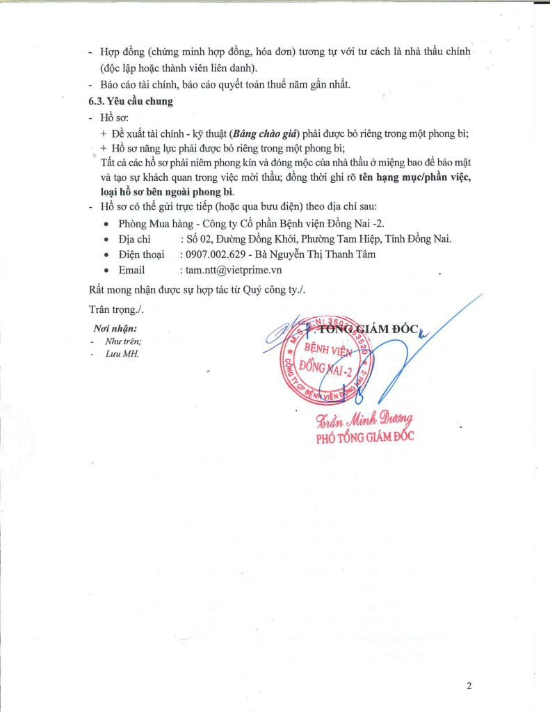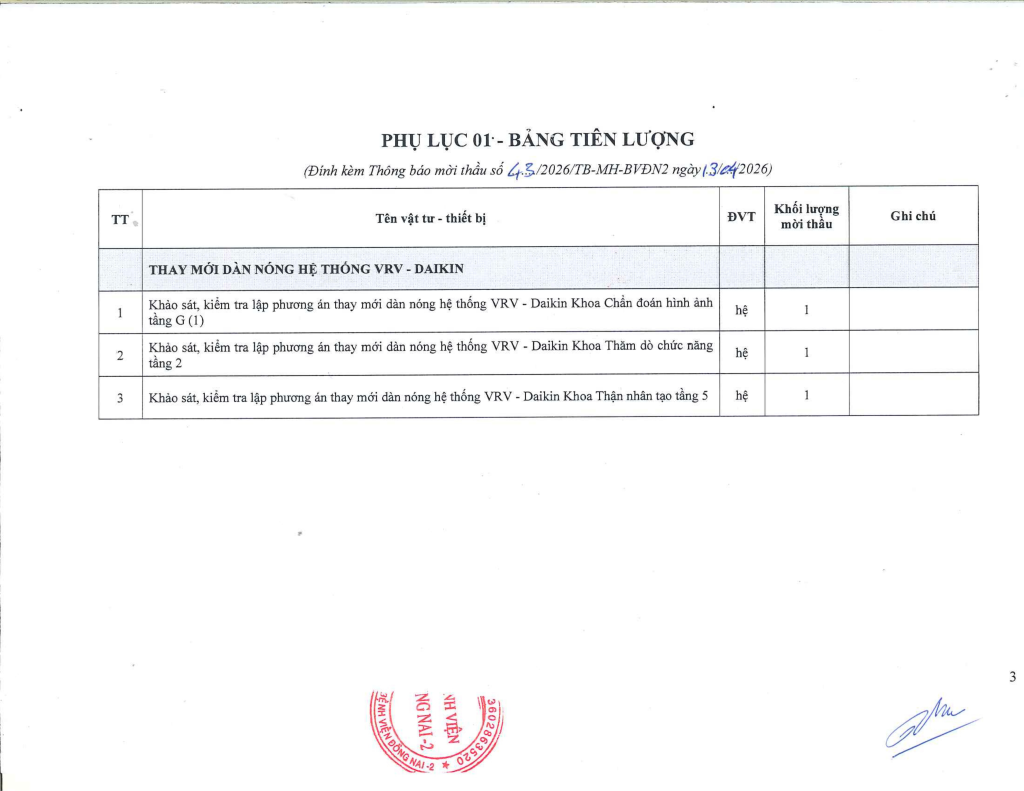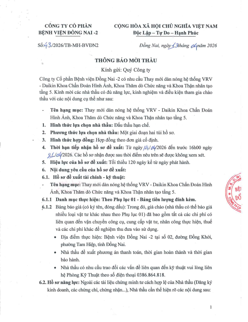 Công ty Cổ phần Bệnh viện Đồng Nai -2 là chủ dự án Bệnh viện Đồng Nai -2, địa chỉ số 2 đường Đồng Khởi, P. Tam Hiệp, tỉnh Đồng Nai. Hiện nay, Công ty chúng tôi đang triển khai mời thầu “THAY MỚI DÀN NÓNG VRV ” tại Bệnh viện.