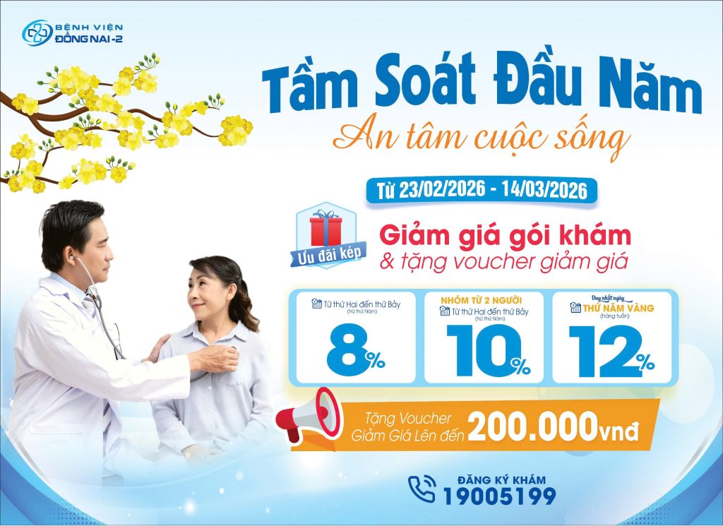 Sức khỏe là vốn quý nhất để bắt đầu một năm mới hanh thông và trọn vẹn. Với mong muốn đồng hành cùng quý khách hàng trong việc chủ động kiểm soát tình trạng sức khỏe sau kỳ nghỉ Tết, Bệnh viện Đồng Nai -2 triển khai chương trình ưu đãi đặc biệt: “Tầm soát đầu năm – An tâm cuộc sống”.