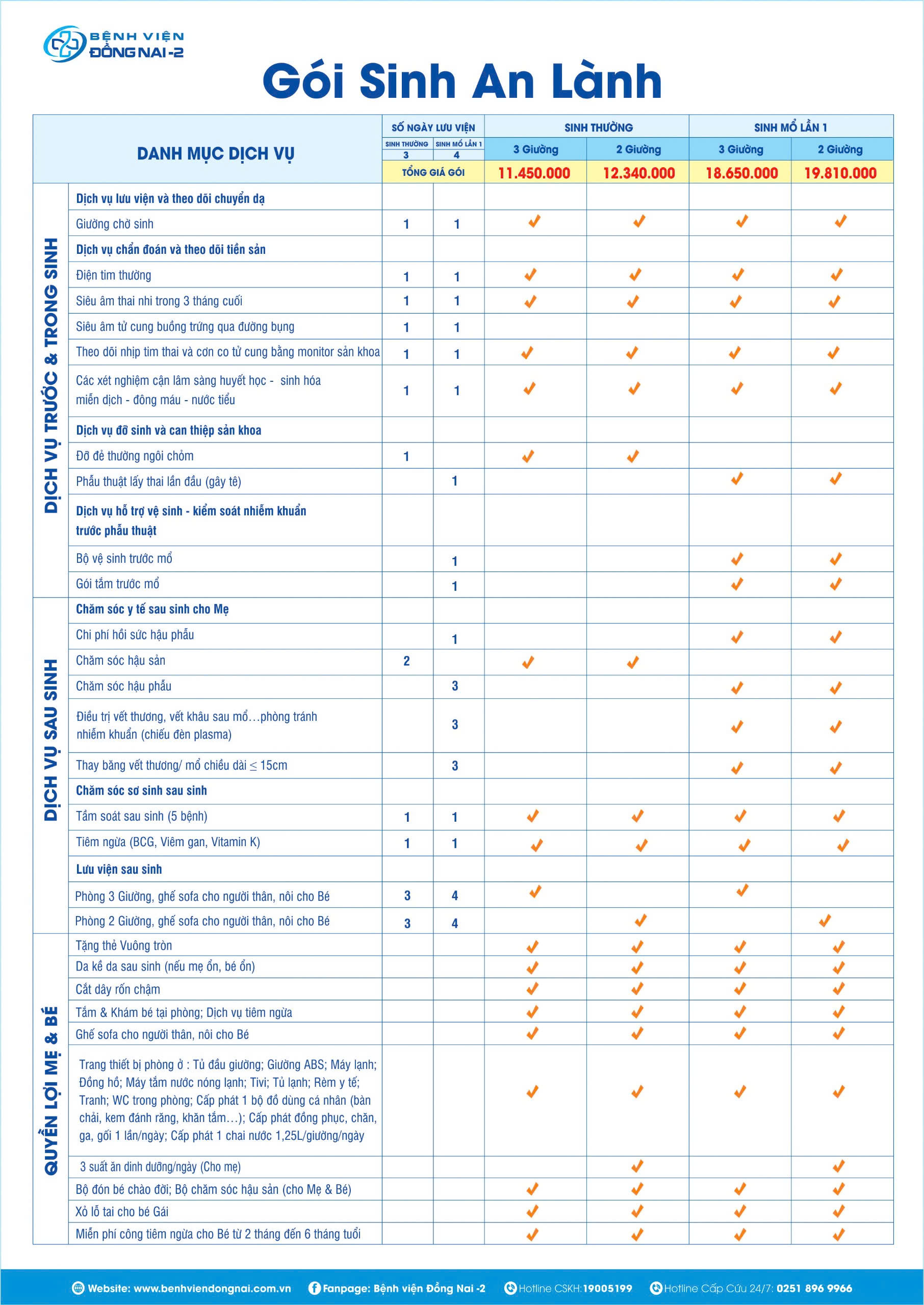 Nhằm đảm bảo sức khỏe tối ưu cho mẹ và nền tảng phát triển toàn diện cho bé từ trong bụng mẹ, Bệnh viện Đồng Nai -2 cung cấp dịch vụ chăm sóc thai sản trọn gói với mức giá vô cùng hấp dẫn sau:
