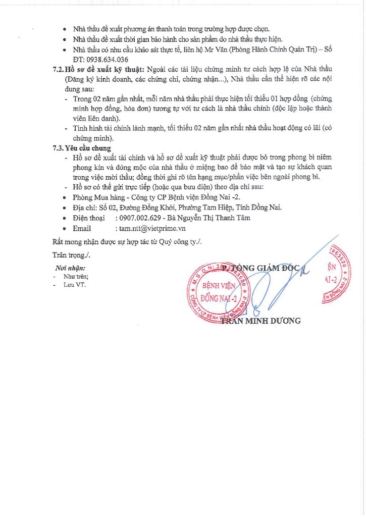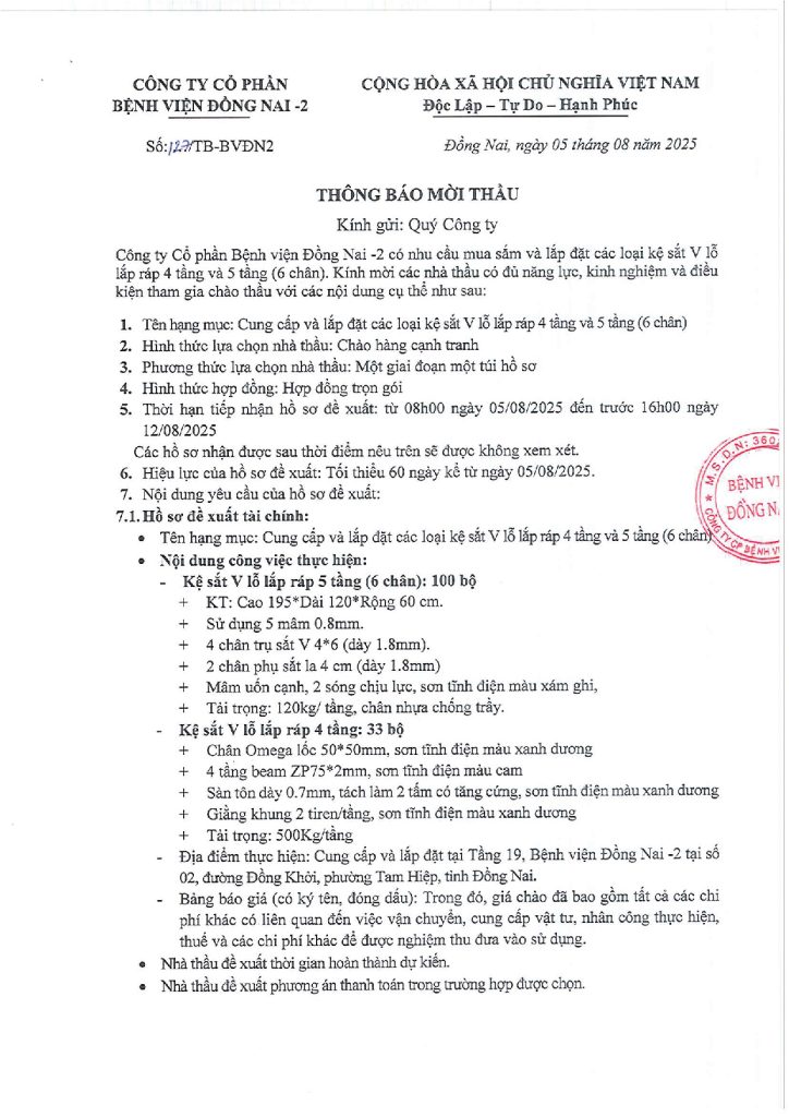 Công ty Cổ phần Bệnh viện Đồng Nai -2 là chủ dự án Bệnh viện Đồng Nai -2, địa chỉ số 2 đường Đồng Khởi, P. Tam Hiệp, tỉnh Đồng Nai. Hiện nay, Công ty chúng tôi đang triển khai mời thầu “CUNG CẤP VÀ LẮP ĐẶT KỆ SẮT V 4 TẦNG VÀ 5 TẦNG” tại Bệnh viện.