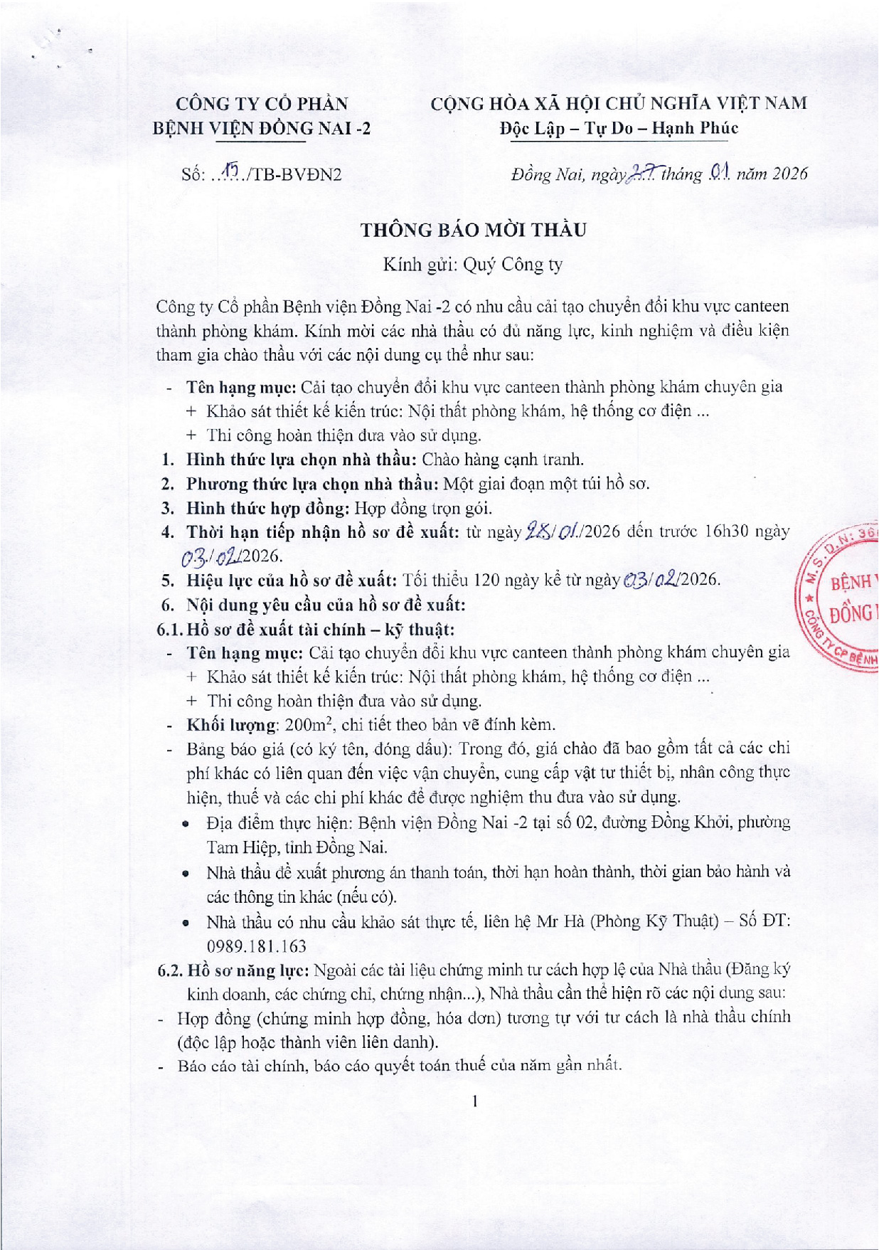 Công ty Cổ phần Bệnh viện Đồng Nai -2 là chủ dự án Bệnh viện Đồng Nai -2, địa chỉ số 2 đường Đồng Khởi, P. Tam Hiệp, tỉnh Đồng Nai. Hiện nay, Công ty chúng tôi đang triển khai mời thầu “CẢI TẠO CHUYỂN ĐỔI KHU VỰC CANTEEN” tại Bệnh viện.