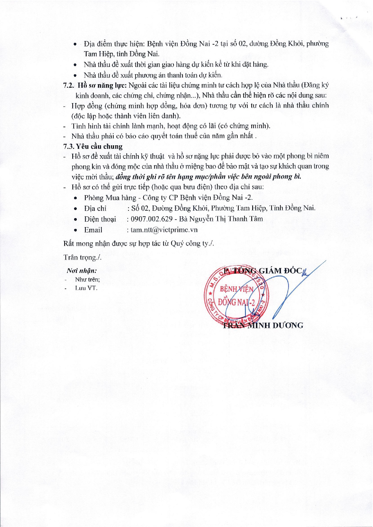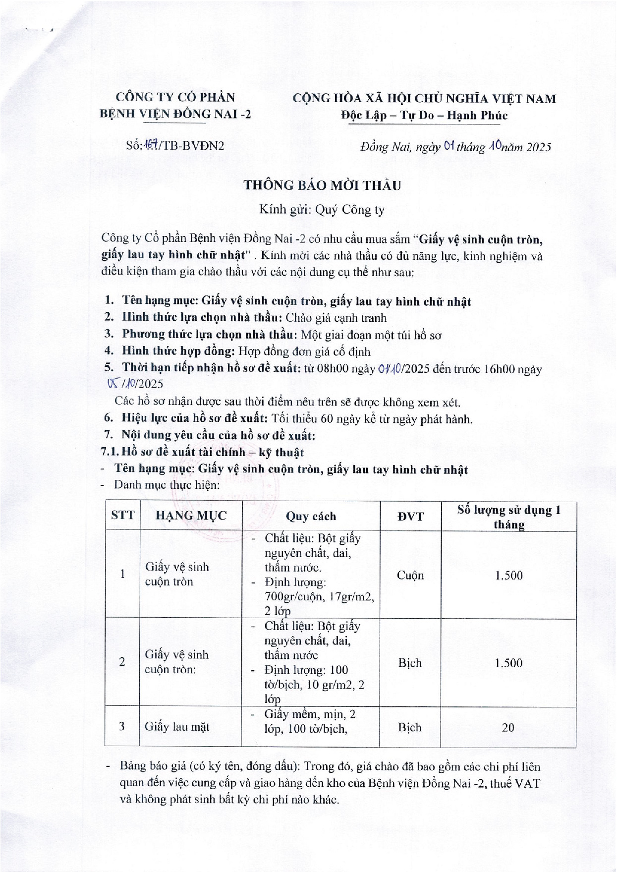 Công ty Cổ phần Bệnh viện Đồng Nai -2 là chủ dự án Bệnh viện Đồng Nai -2, địa chỉ số 2 đường Đồng Khởi, P. Tam Hiệp, tỉnh Đồng Nai. Hiện nay, Công ty chúng tôi đang triển khai mời thầu cung cấp “GIẤY VỆ SINH CUỘN TRÒN, GIẤY LAU TAY HÌNH CHỮ NHẬT” tại Bệnh viện.