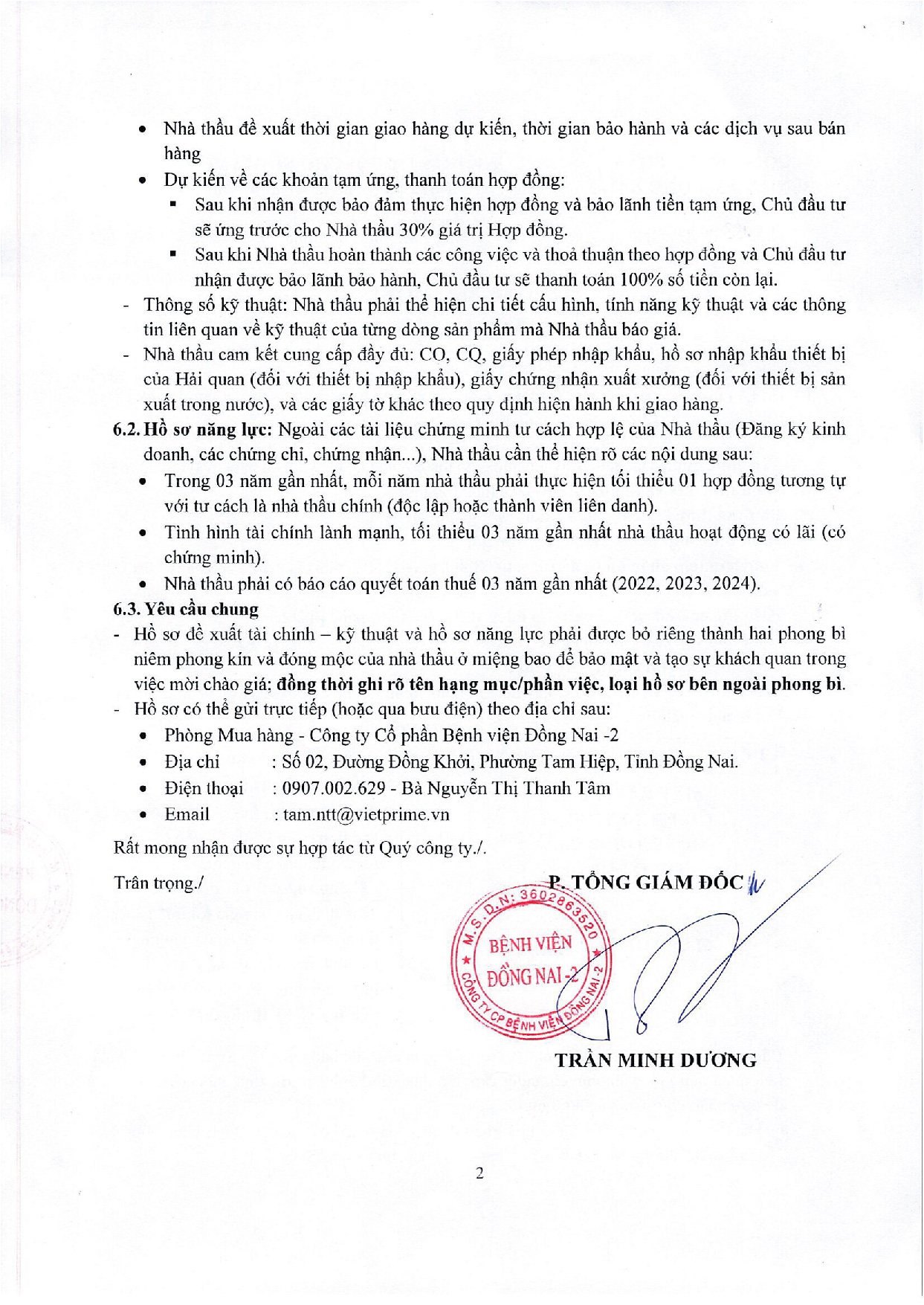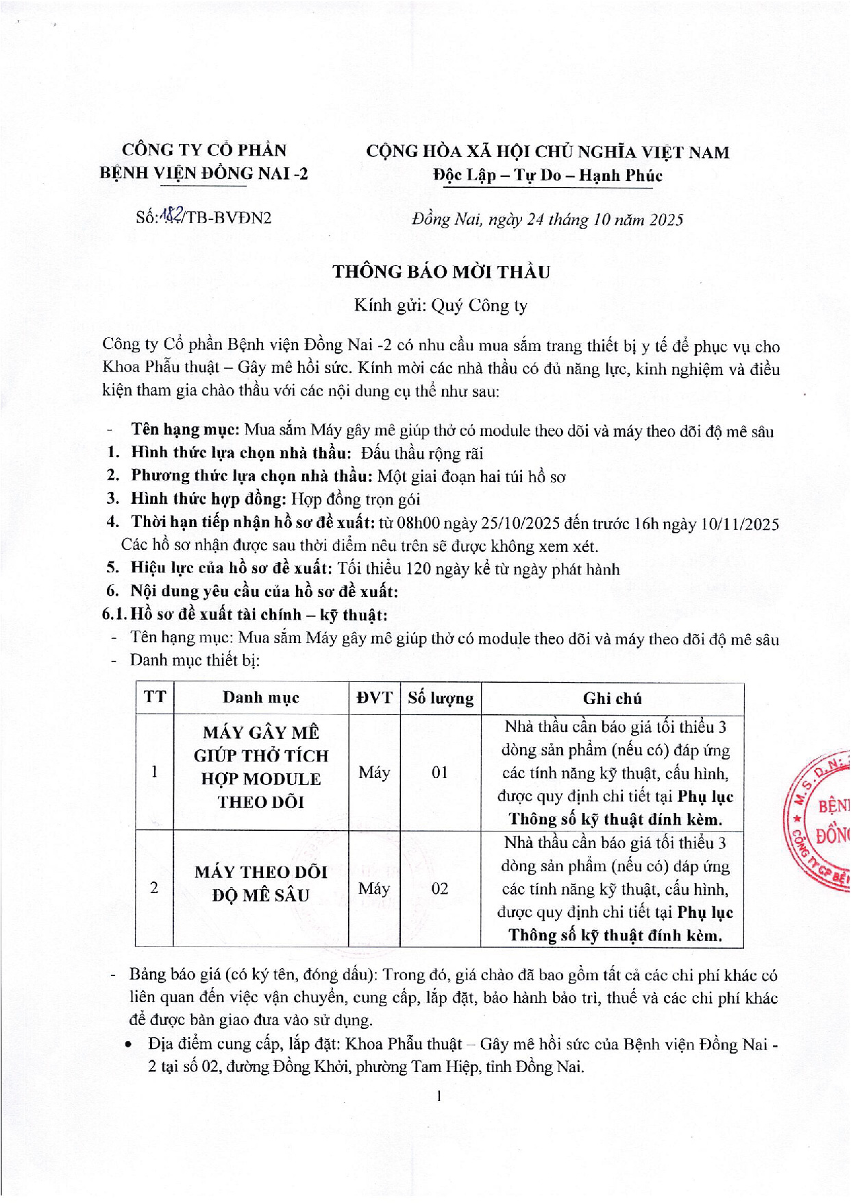 Công ty Cổ phần Bệnh viện Đồng Nai -2 là chủ dự án Bệnh viện Đồng Nai -2, địa chỉ số 2 đường Đồng Khởi, P. Tam Hiệp, tỉnh Đồng Nai. Hiện nay, Công ty chúng tôi đang triển khai mời thầu “MÁY GÂY MÊ GIÚP THỞ CÓ MODULE THEO DÕI VÀ MÁY THEO DÕI ĐỘ MÊ SÂU” tại Bệnh viện.