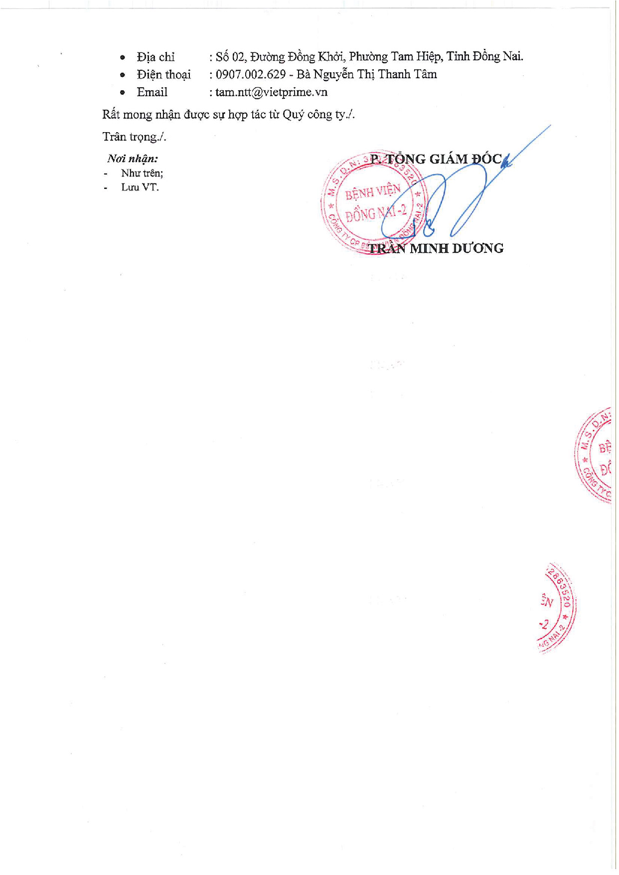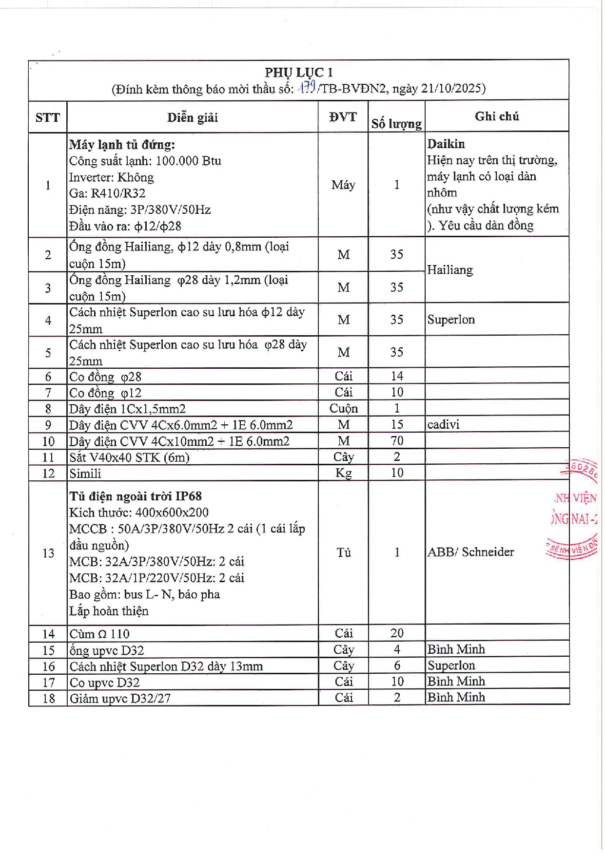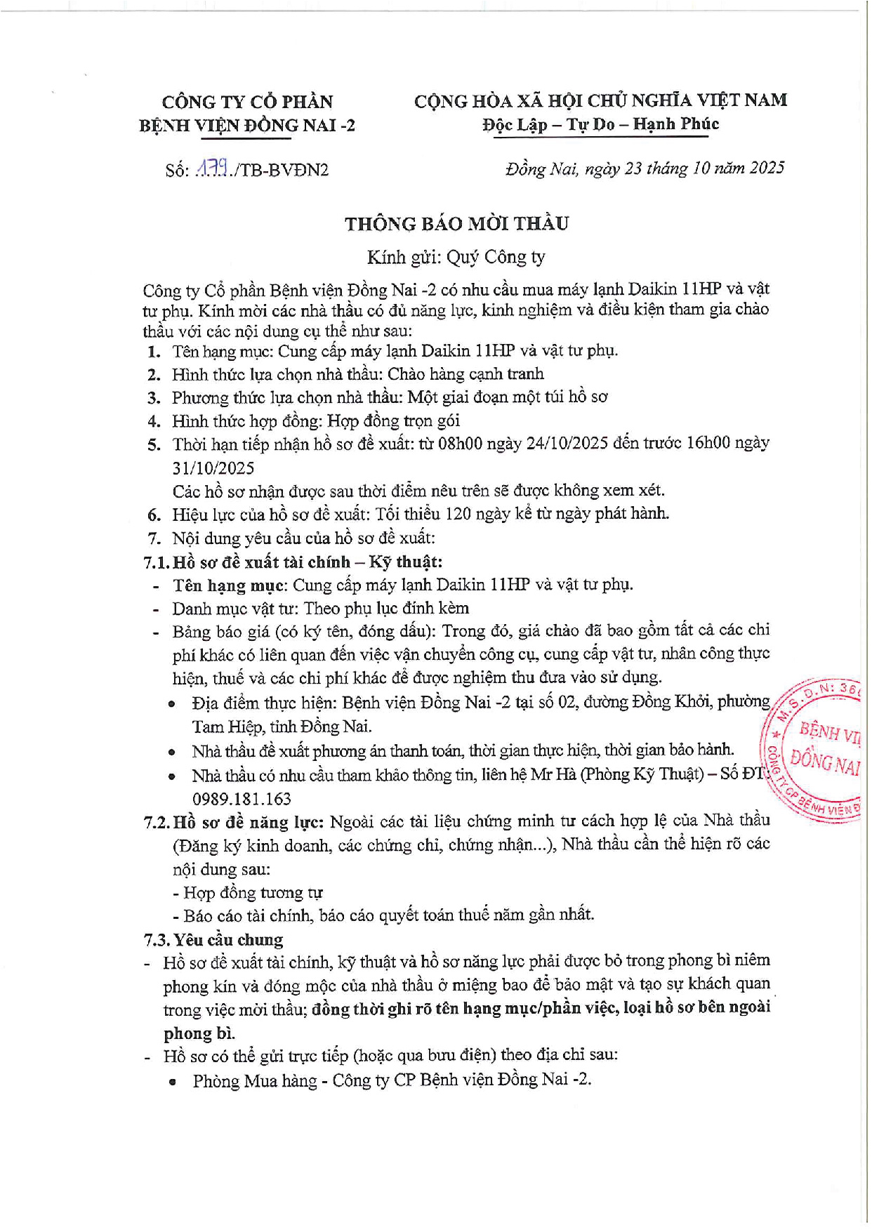 Công ty Cổ phần Bệnh viện Đồng Nai -2 là chủ dự án Bệnh viện Đồng Nai -2, địa chỉ số 2 đường Đồng Khởi, P. Tam Hiệp, tỉnh Đồng Nai. Hiện nay, Công ty chúng tôi đang triển khai mời thầu “CUNG CẤP MÁY LẠNH DAIKIN 11HP VÀ VẬT TƯ PHỤ” tại Bệnh viện.