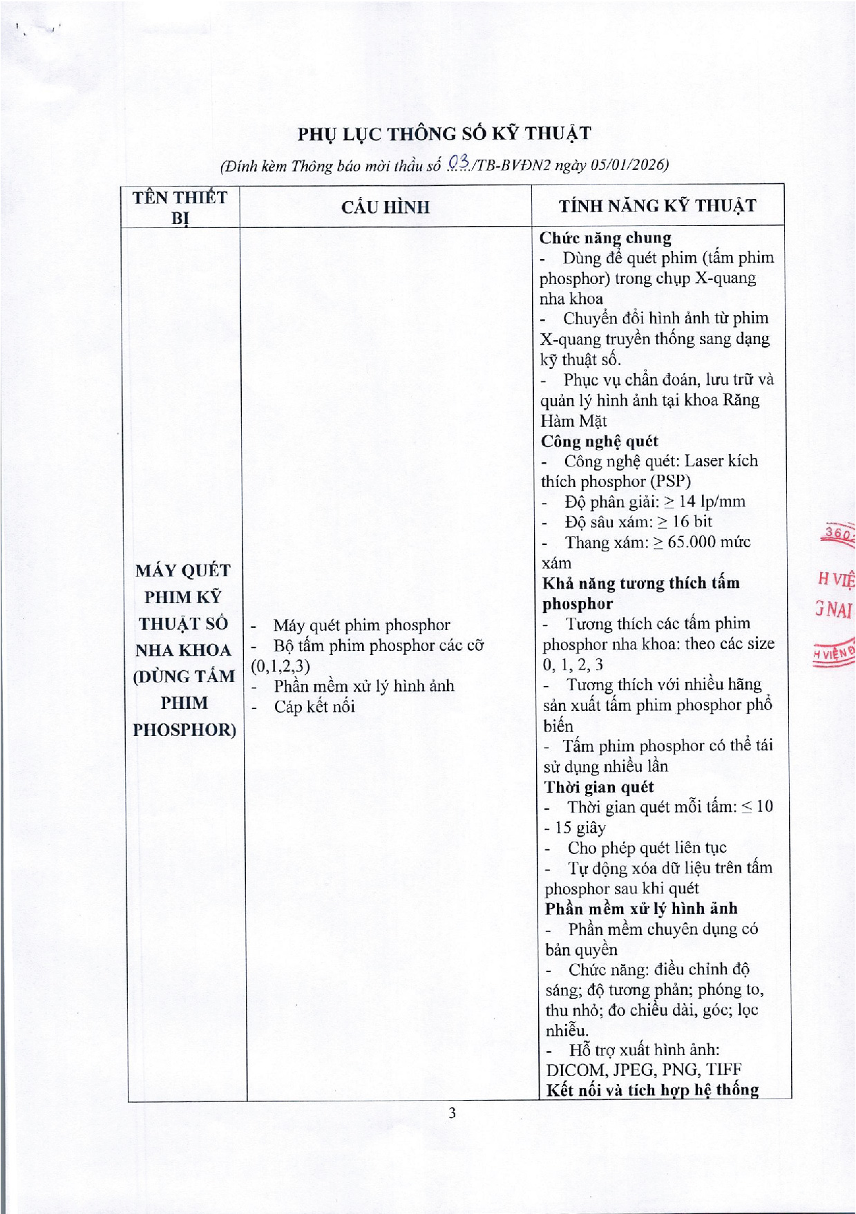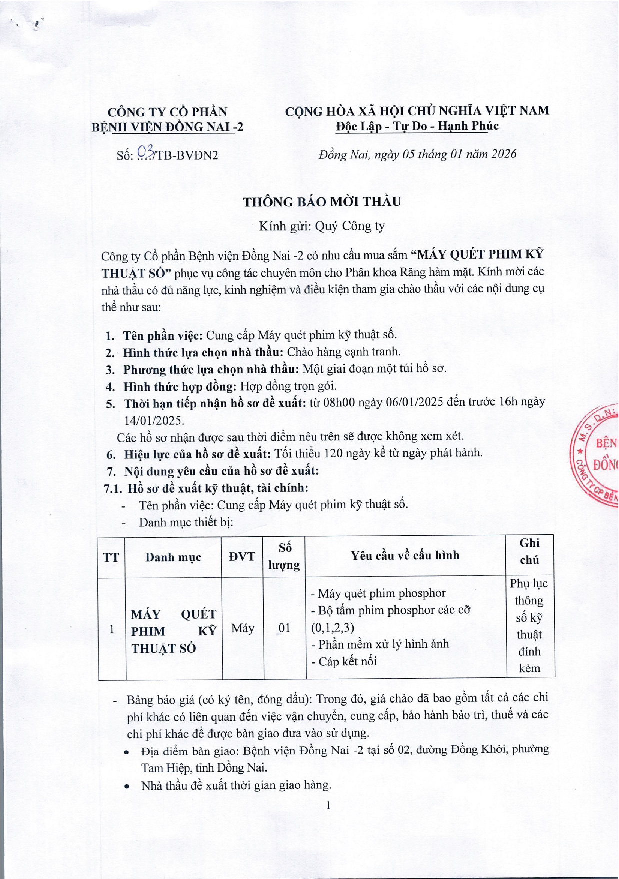 Công ty Cổ phần Bệnh viện Đồng Nai -2 là chủ dự án Bệnh viện Đồng Nai -2, địa chỉ số 2 đường Đồng Khởi, P. Tam Hiệp, tỉnh Đồng Nai. Hiện nay, Công ty chúng tôi đang triển khai mời thầu “CUNG CẤP MÁY QUÉT PHIM KỸ THUẬT SỐ” tại Bệnh viện.