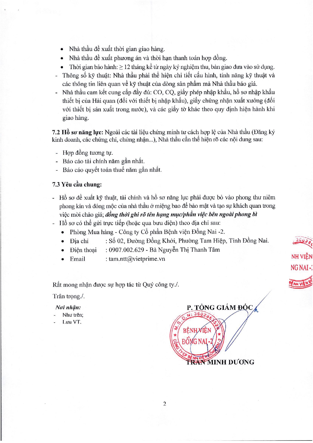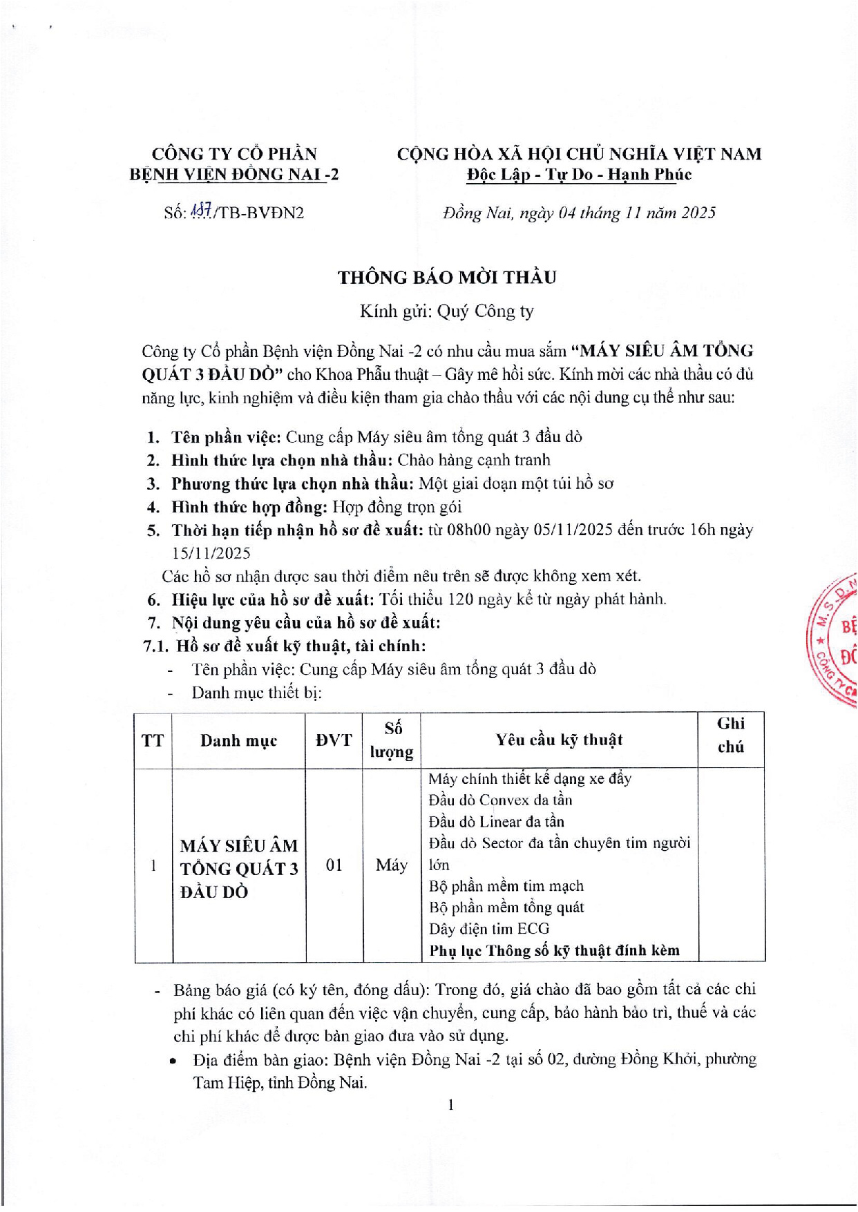 Công ty Cổ phần Bệnh viện Đồng Nai -2 là chủ dự án Bệnh viện Đồng Nai -2, địa chỉ số 2 đường Đồng Khởi, P. Tam Hiệp, tỉnh Đồng Nai. Hiện nay, Công ty chúng tôi đang triển khai mời thầu “CUNG CẤP MÁY SIÊU ÂM TỔNG QUÁT BA ĐẦU DÒ” tại Bệnh viện.