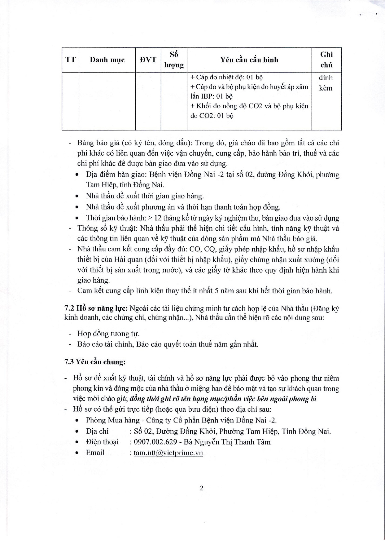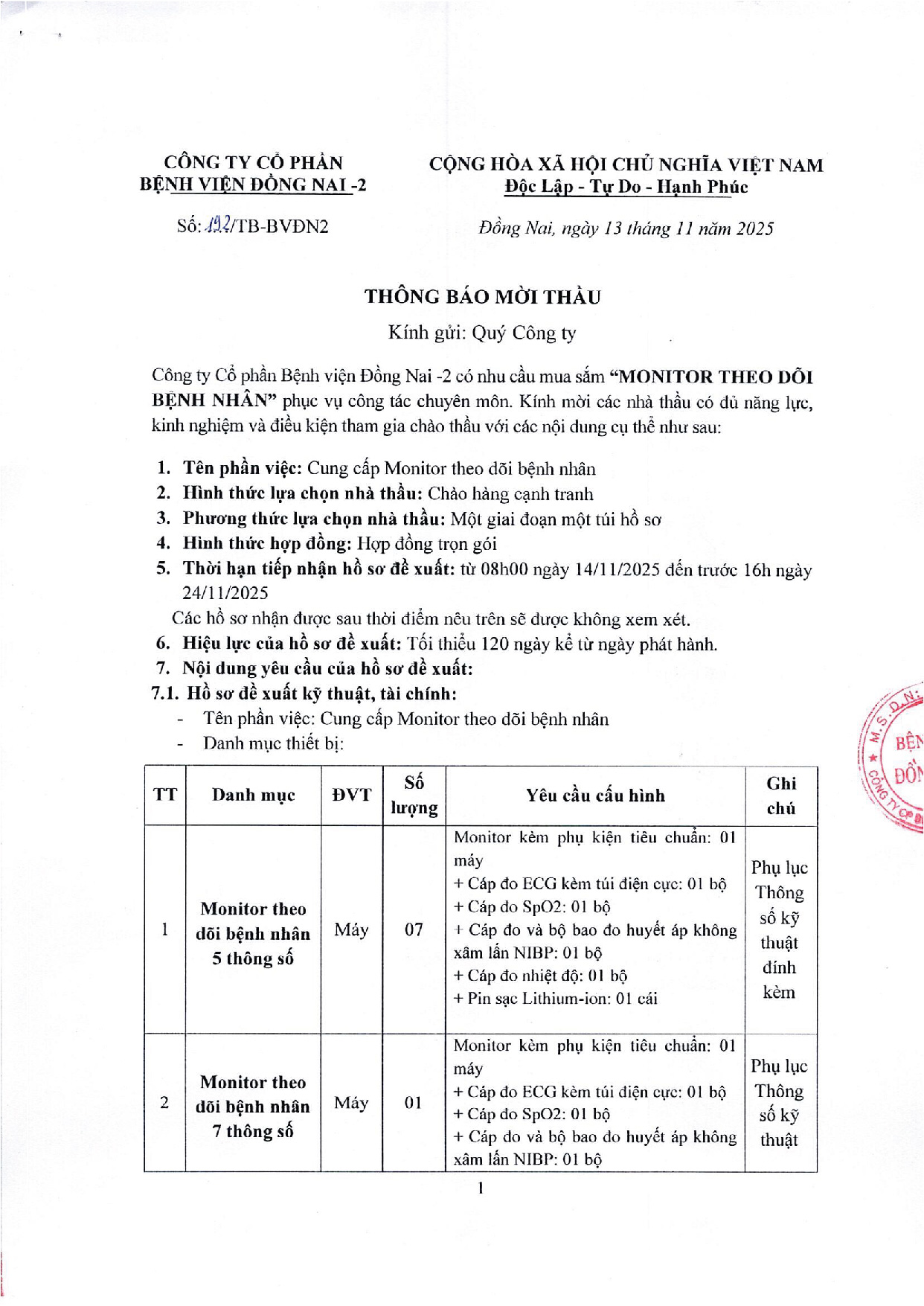 Công ty Cổ phần Bệnh viện Đồng Nai -2 là chủ dự án Bệnh viện Đồng Nai -2, địa chỉ số 2 đường Đồng Khởi, P. Tam Hiệp, tỉnh Đồng Nai. Hiện nay, Công ty chúng tôi đang triển khai mời thầu “CUNG CẤP MONITOR THEO DÕI BỆNH NHÂN” tại Bệnh viện.