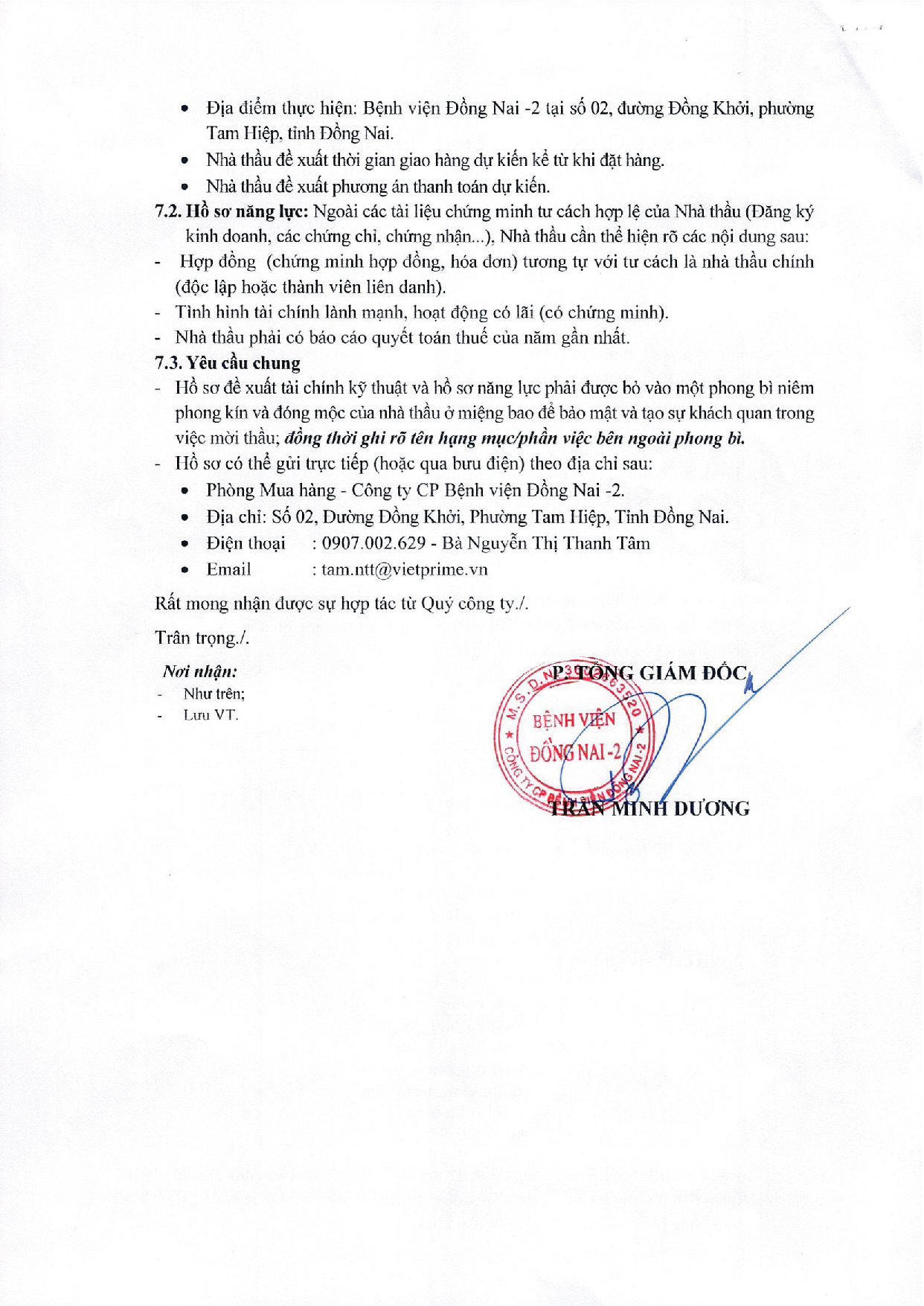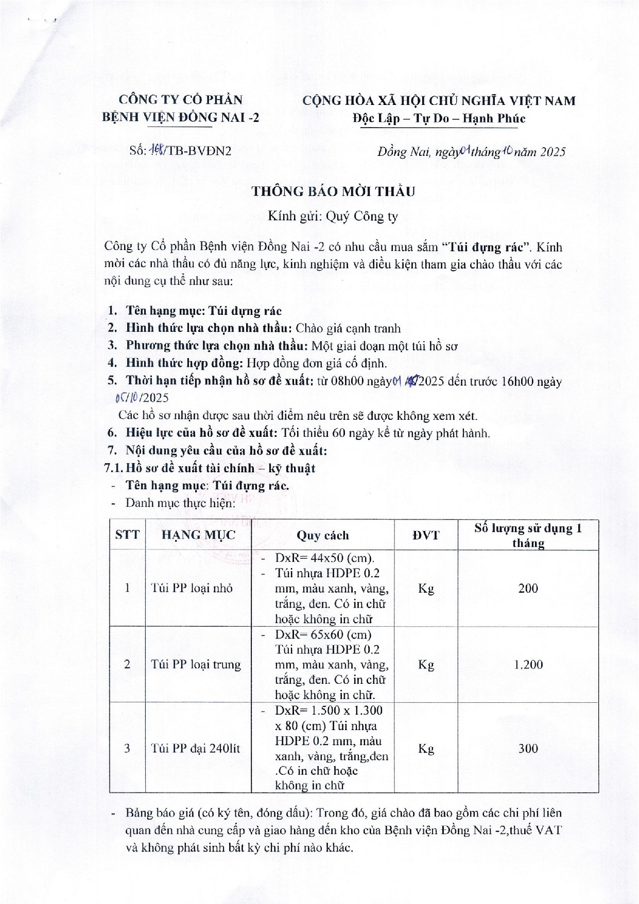 Công ty Cổ phần Bệnh viện Đồng Nai -2 là chủ dự án Bệnh viện Đồng Nai -2, địa chỉ số 2 đường Đồng Khởi, P. Tam Hiệp, tỉnh Đồng Nai. Hiện nay, Công ty chúng tôi đang triển khai mời thầu cung cấp “TÚI ĐỰNG RÁC” tại Bệnh viện.