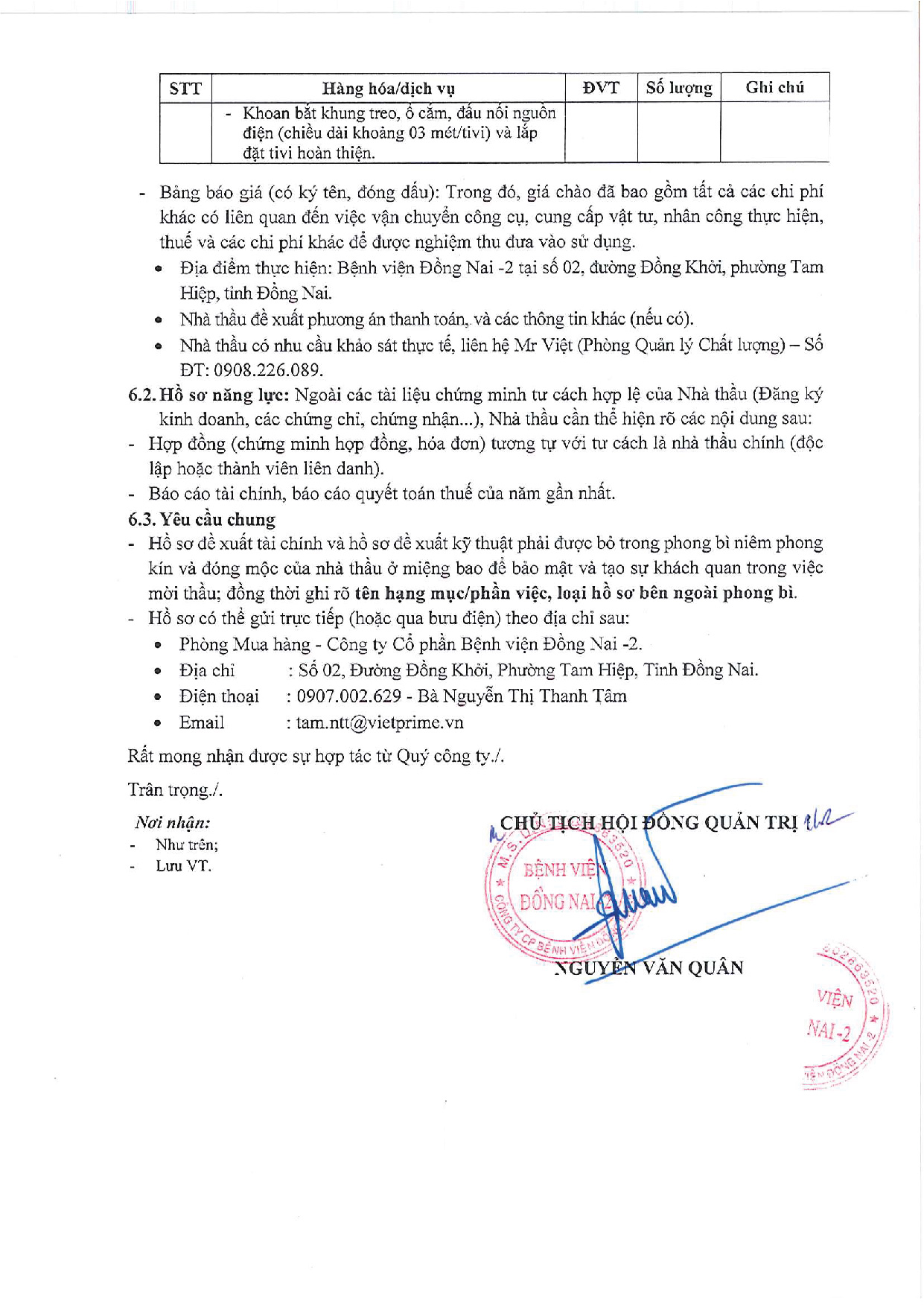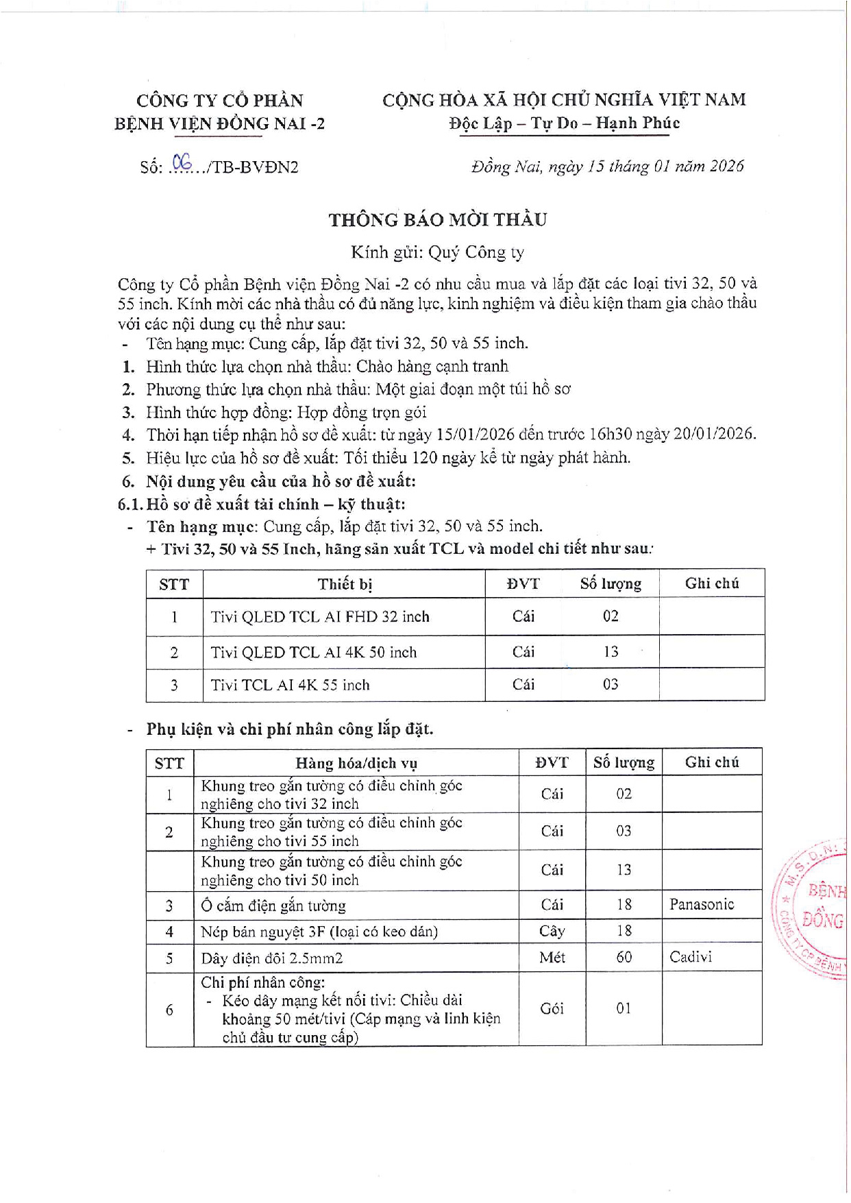 Công ty Cổ phần Bệnh viện Đồng Nai -2 là chủ dự án Bệnh viện Đồng Nai -2, địa chỉ số 2 đường Đồng Khởi, P. Tam Hiệp, tỉnh Đồng Nai. Hiện nay, Công ty chúng tôi đang triển khai mời thầu “CUNG CẤP VÀ LẮP ĐẶT TIVI 32, 50 VÀ 55 INCH” tại Bệnh viện.