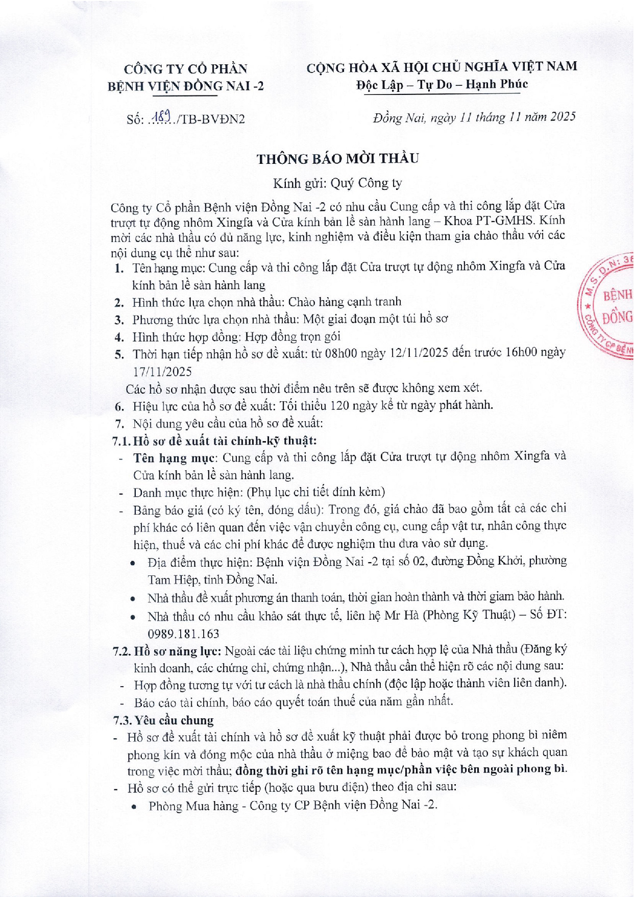 Công ty Cổ phần Bệnh viện Đồng Nai -2 là chủ dự án Bệnh viện Đồng Nai -2, địa chỉ số 2 đường Đồng Khởi, P. Tam Hiệp, tỉnh Đồng Nai. Hiện nay, Công ty chúng tôi đang triển khai mời thầu “CUNG CẤP VÀ THI CÔNG LẮP ĐẶT CỬA TRƯỢT TỰ ĐỘNG NHÔM XINGFA VÀ CỬA KÍNH BẢN LỀ” tại Bệnh viện.