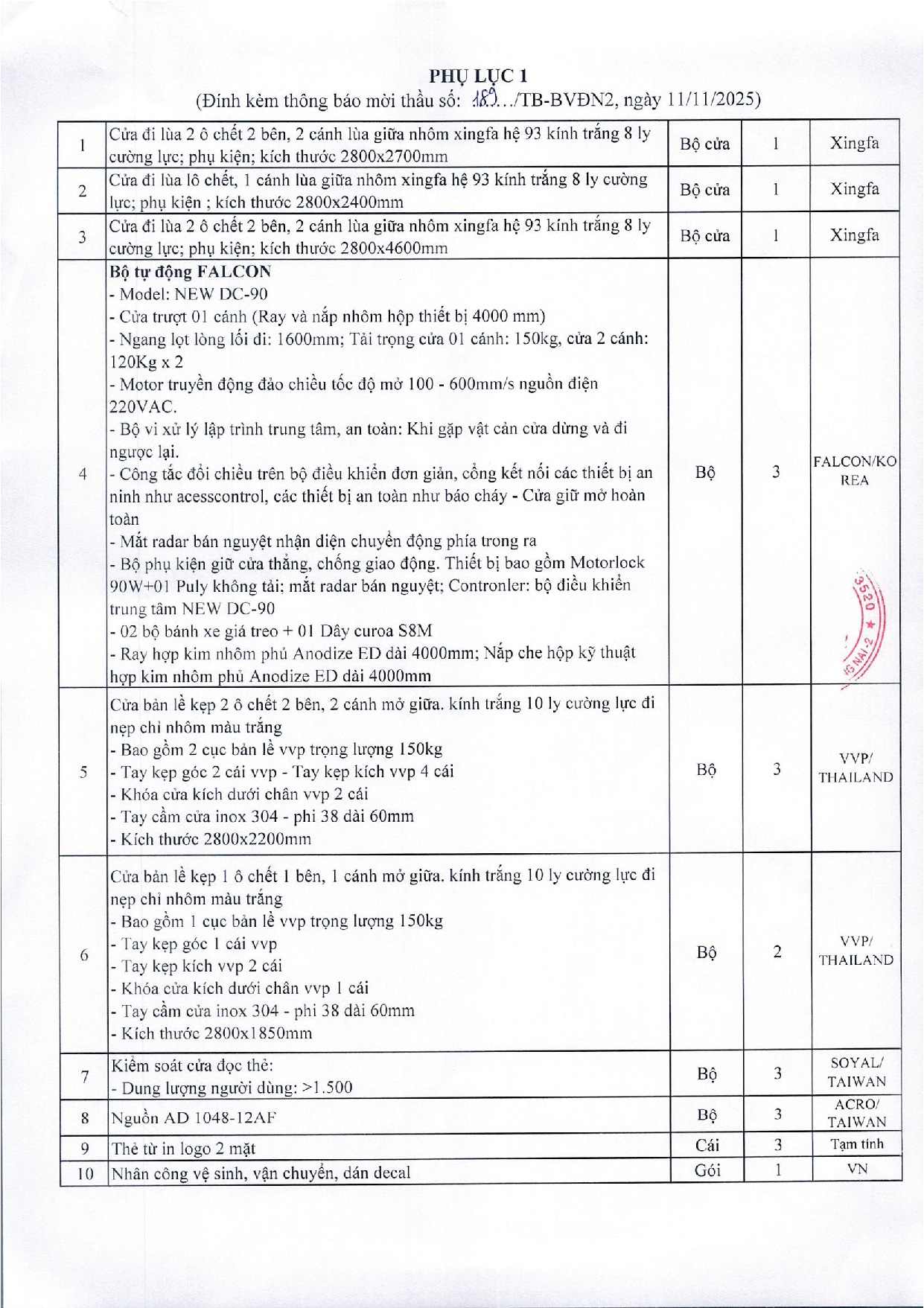 THÔNG BÁO MỜI THẦU CUNG CẤP VÀ THI CÔNG LẮP ĐẶT CỬA TRƯỢT TỰ ĐỘNG NHÔM XINGFA VÀ CỬA KÍNH BẢN LỀ
