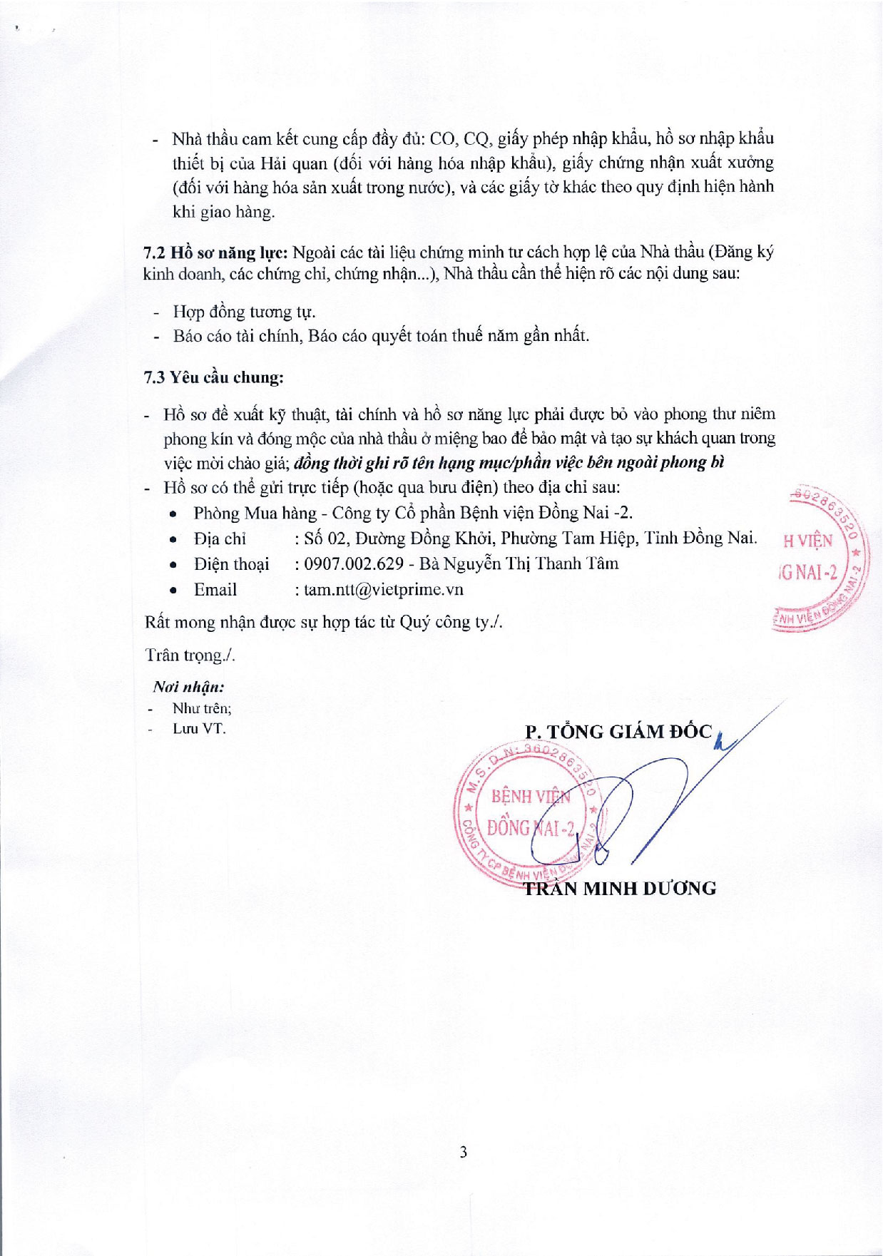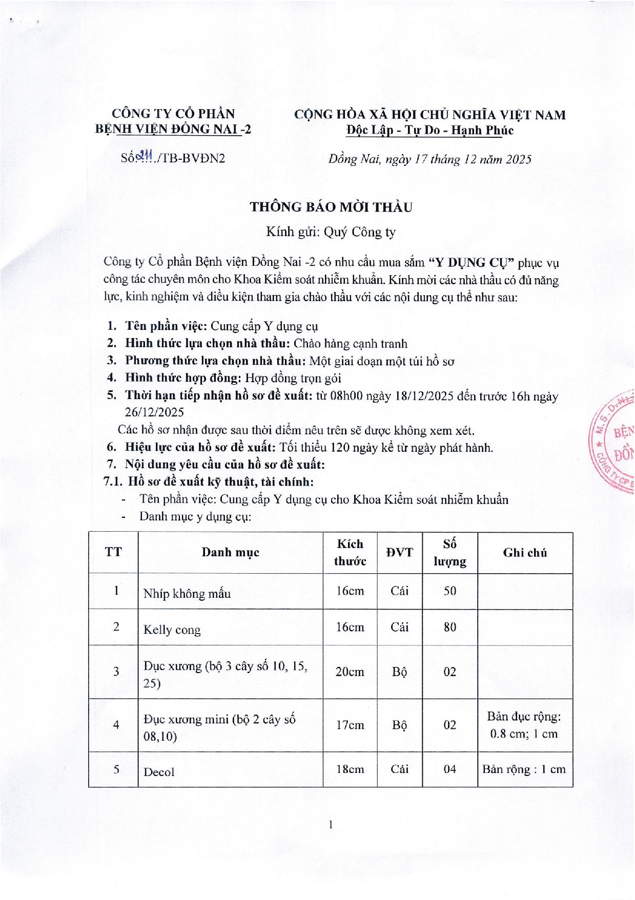Công ty Cổ phần Bệnh viện Đồng Nai -2 là chủ dự án Bệnh viện Đồng Nai -2, địa chỉ số 2 đường Đồng Khởi, P. Tam Hiệp, tỉnh Đồng Nai. Hiện nay, Công ty chúng tôi đang triển khai mời thầu “CUNG CẤP Y DỤNG CỤ CHUYÊN MÔN KHOA KIỂM SOÁT NHIỄM KHUẨN” tại Bệnh viện.