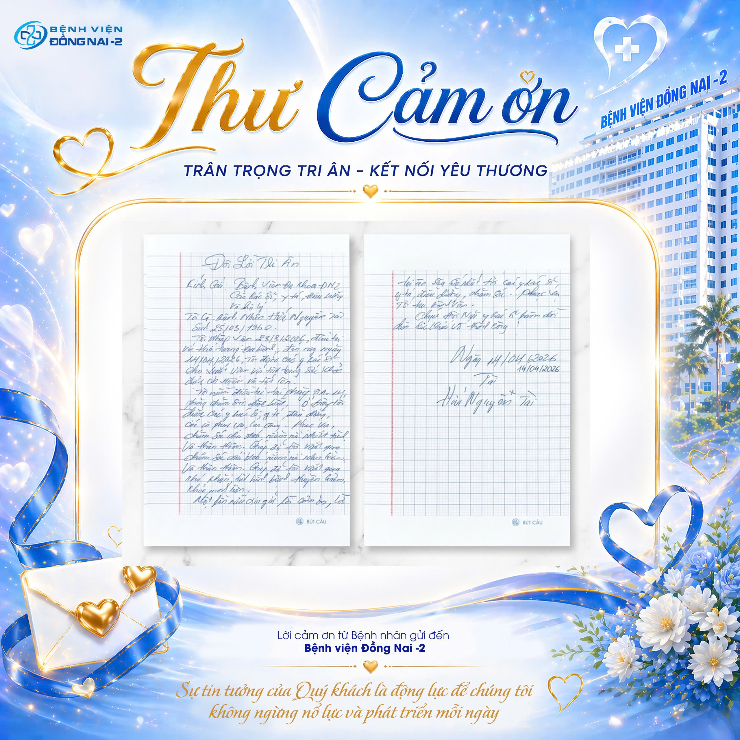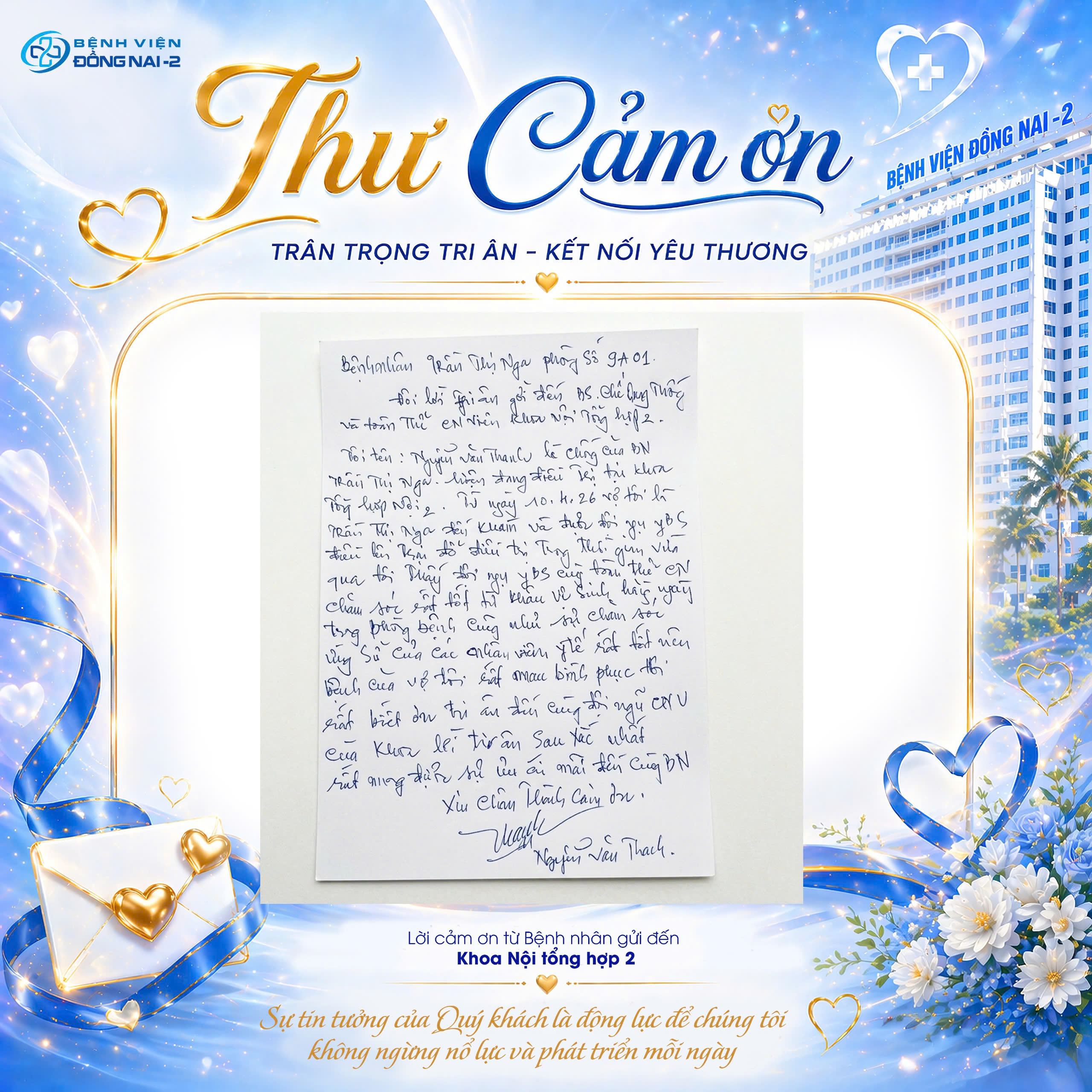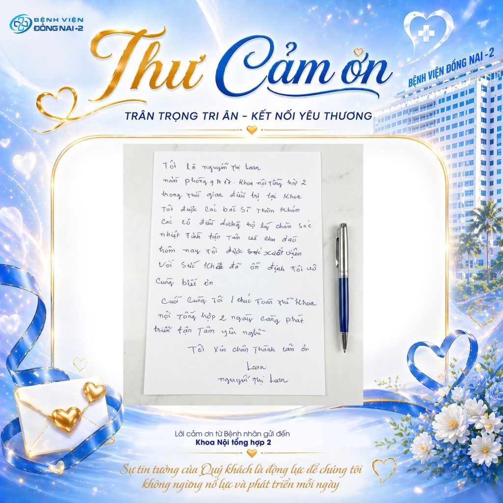 Bệnh viện Đồng Nai -2 xin trân trọng cảm ơn quý bệnh nhân và thân nhân đã luôn tin yêu. Chúng tôi cam kết giữ vững tinh thần “Tận lực – Tận tâm”. Mục tiêu là mang lại sự an tâm cho mọi gia đình.